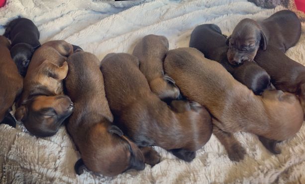 Our puppies include red and black and tan. Colors will vary depending on the parent dogs.