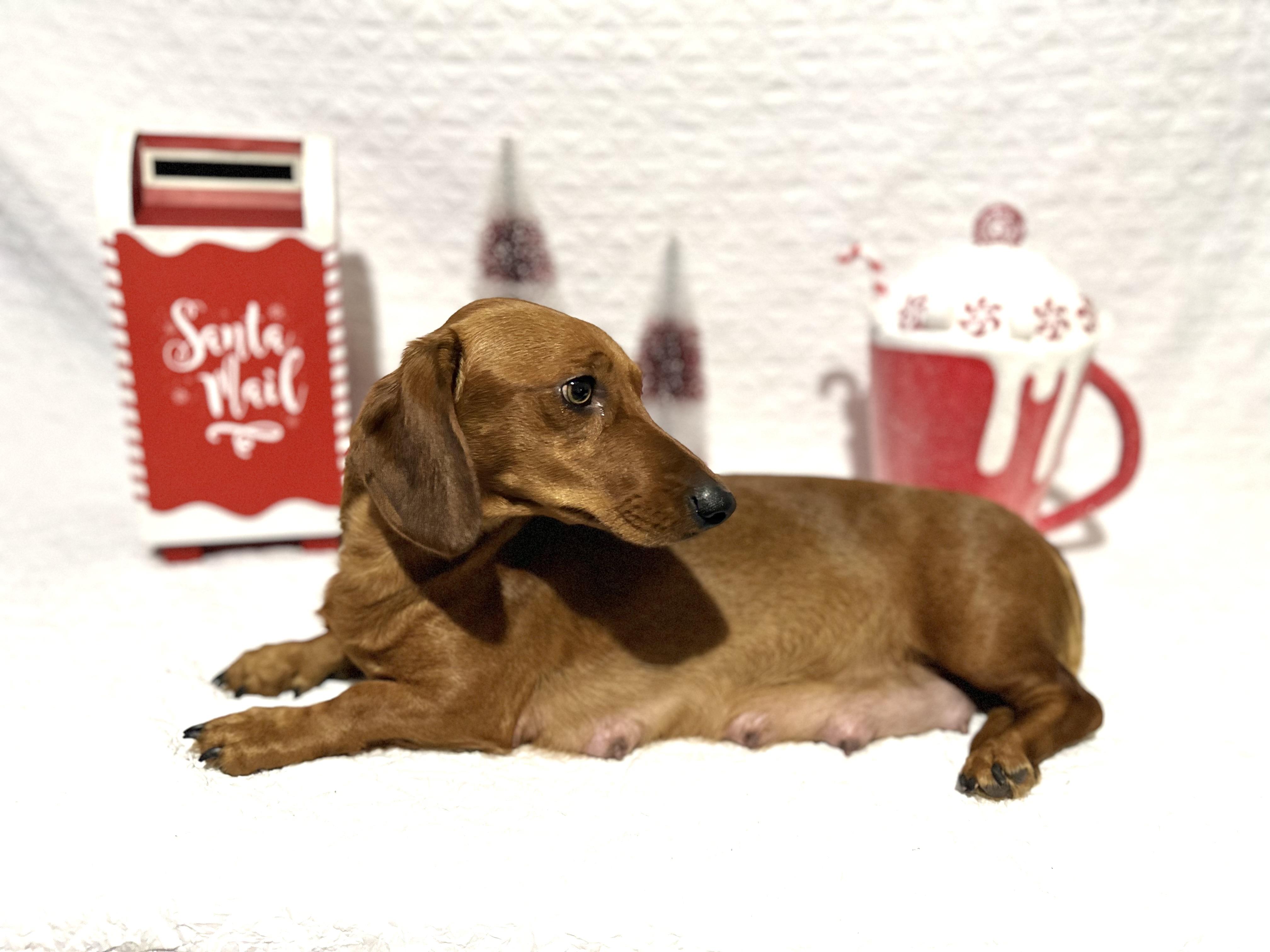 Lola is a female Dachshund. Carefully selected as a great representative of her breed, Felicia decided to make her part of their program. Felicia has passed Good Dog’s screening process, which involved a review of their breeding practices, environment, and the mental and physical health of their dogs.