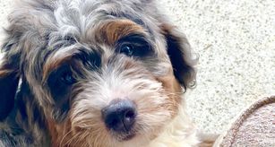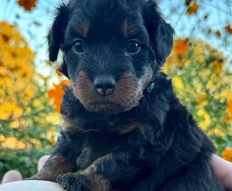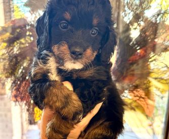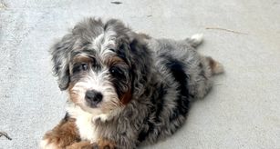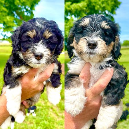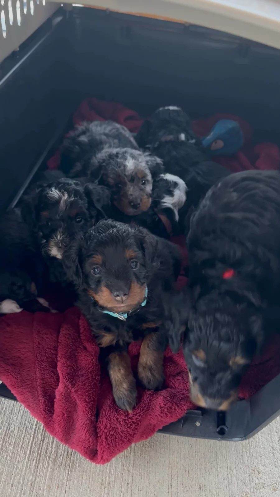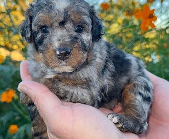 Our Bernedoodle puppies include tri-color and blue merle. Aussiedoodle puppies include brown and white, red merle, black phantom, and red phantom. Colors will vary depending on the parent dogs.