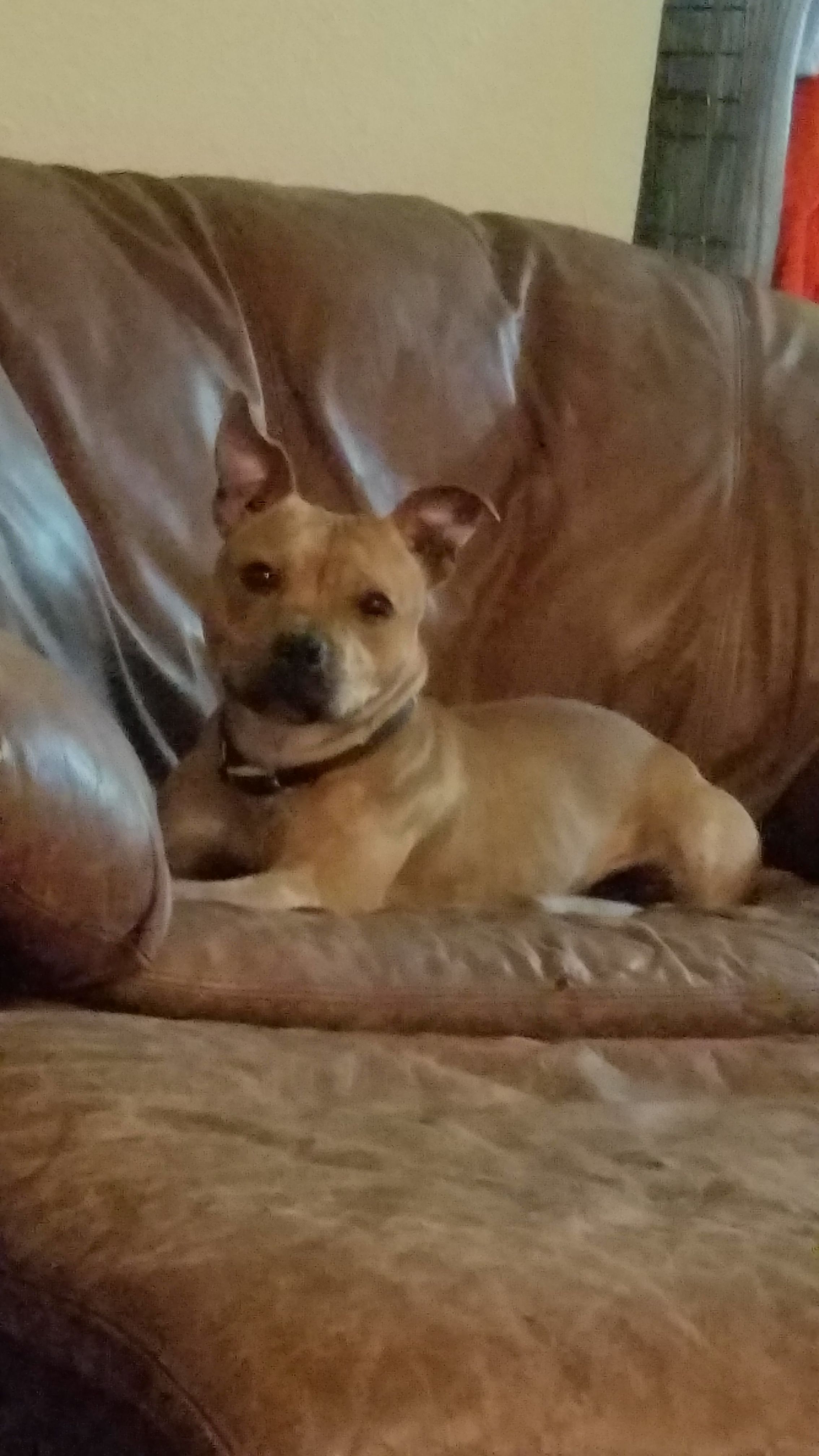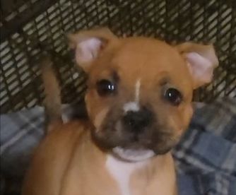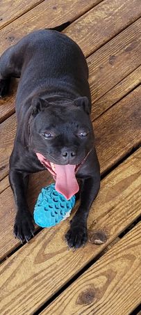 Jinx is a male Staffordshire Bull Terrier. Carefully selected as a great representative of his breed, Tammy decided to make him part of their program. Tammy has passed Good Dog’s screening process, which involved a review of their breeding practices, environment, and the mental and physical health of their dogs.