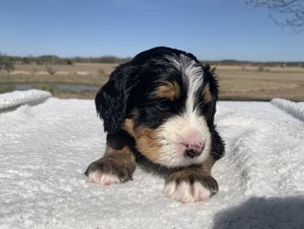 I'm Tiffany N., the breeder behind Lone Willow Bernedoodles located in Belleville, WI. We decided to have our first litter in March '23 after finding Willow to be the most amazing dog, and now the most amazing mother. She's a 60 pound lap dog who is happiest just lounging with you. This litter was bred to keep the low to no shedding and bring in more Bernese traits.