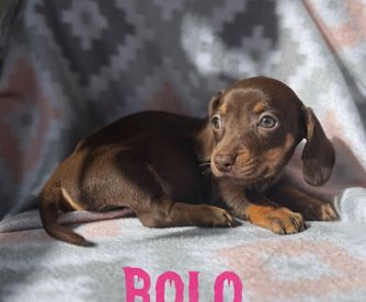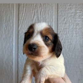 Our Basset Hound puppies are red and white. Dachshund puppies include piebald, cream, red, chocolate, fawn (isabella), brindle, fawn (isabella) and cream, blue and cream, blue and tan, chocolate and tan, fawn (isabella) and tan, black and tan, and dapple. Colors will vary depending on the parent dogs.