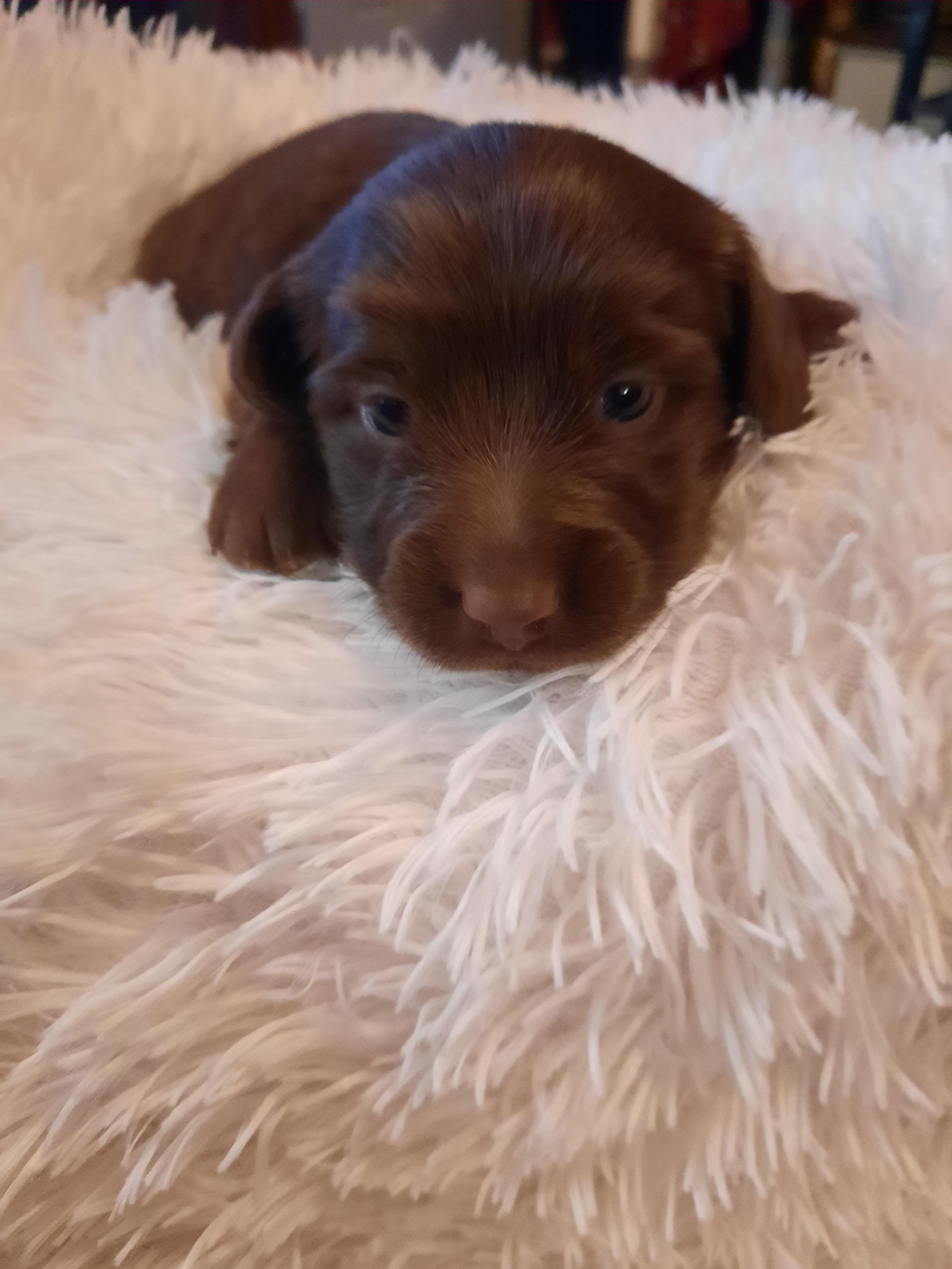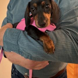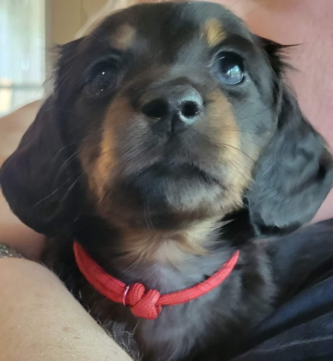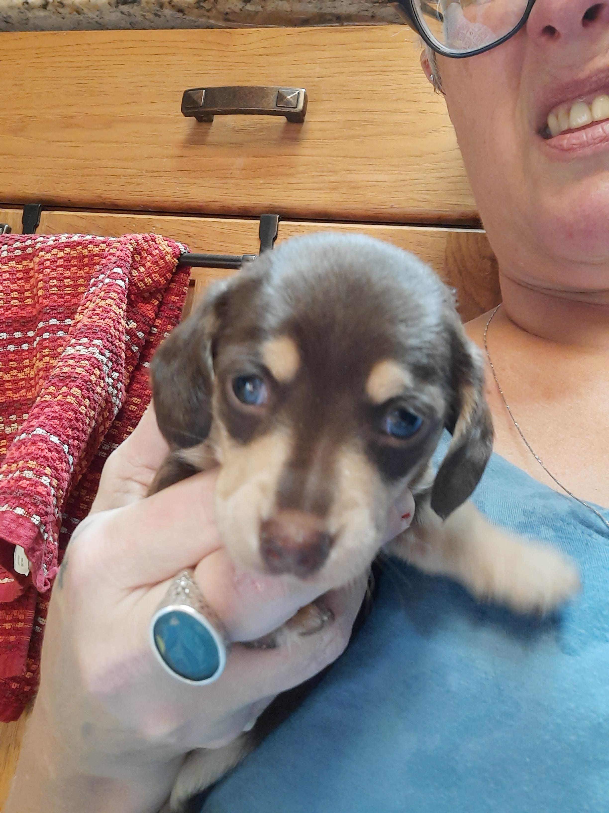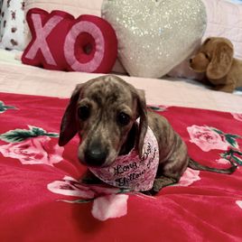 Kim was excellent to work with when we were looking for our first Doxie baby! We selected a puppy shortly after he was born and she was willing to FaceTime and keep us updated regularly on Frankie. Kim kindly met me at the airport when I arrived from out of state and provided all of the info and supplies I needed to welcome Frankie home. As for the puppy, besides being gorgeous he has the BEST personality and is easygoing, well mannered, and friendly. He got a clean bill of health from the vet and is in great shape. Highly recommend and will use in the future!!!