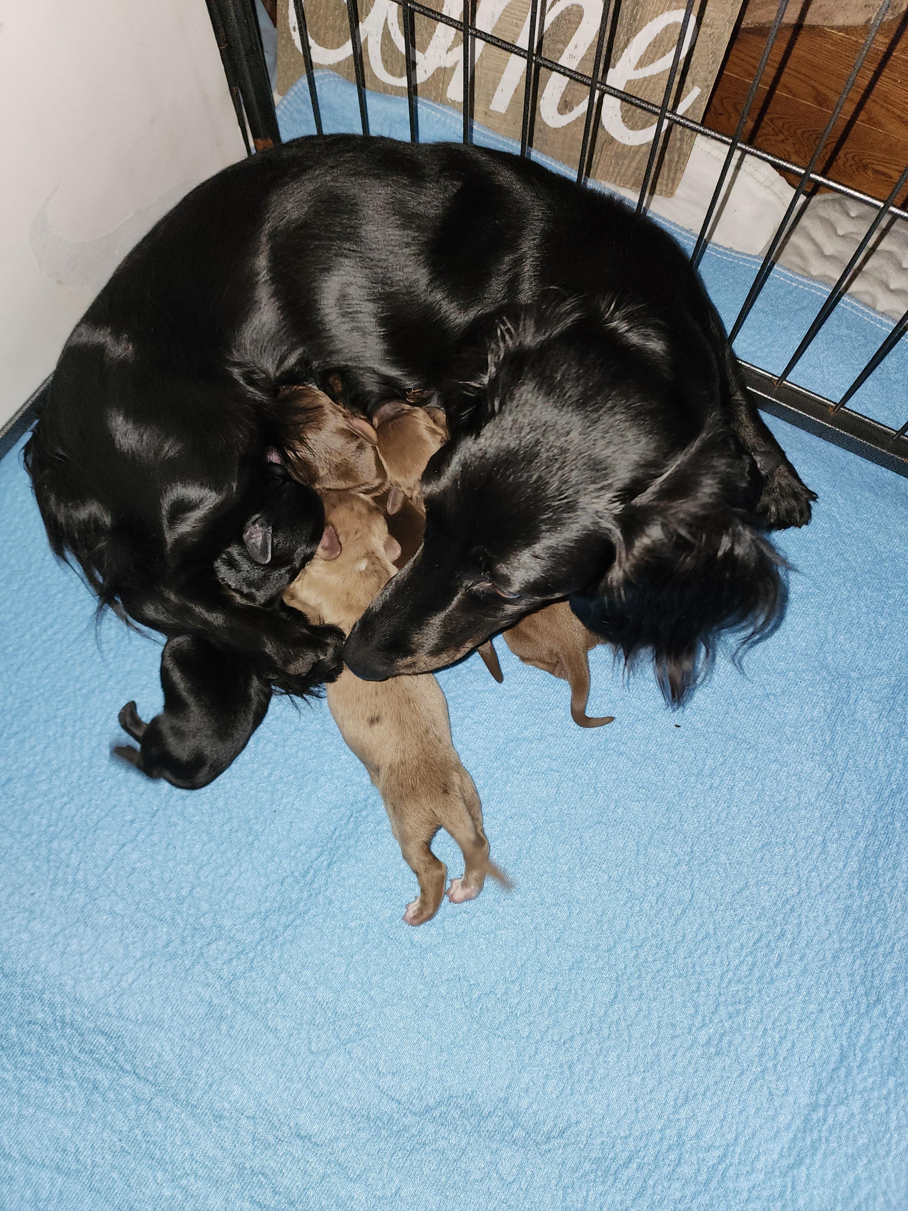 One of our doxies, Sadie, passed from cancer. Our other doxie went into depression so we decided to get her a playmate. We found a longhair male and fell in love at first sight. Well, after 5 months with us, we came home one day and found he and my other doxie had tied. That was our first litter. I was able to place those puppies with great families and it was such a fulfilling feeling! So the rest is history.