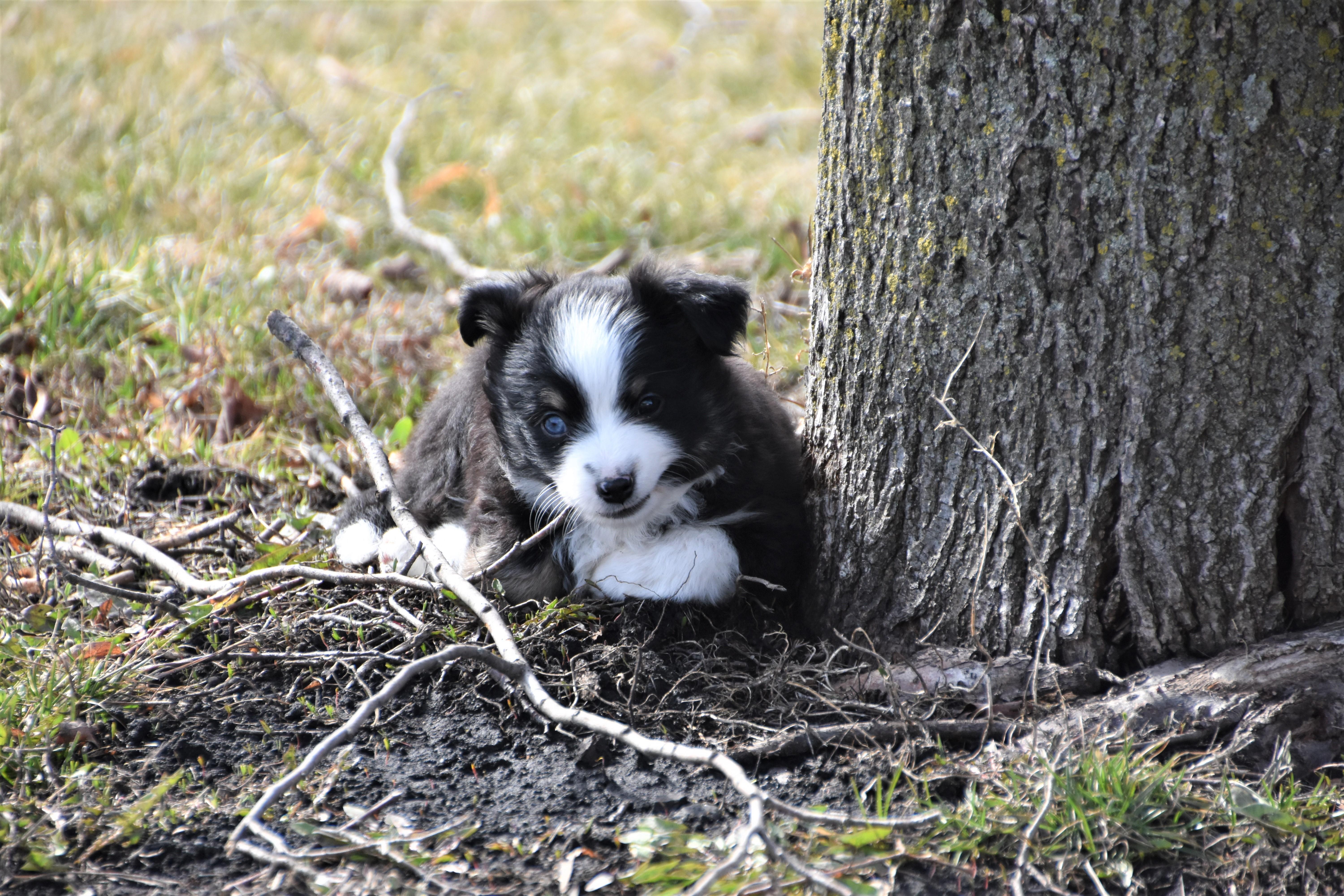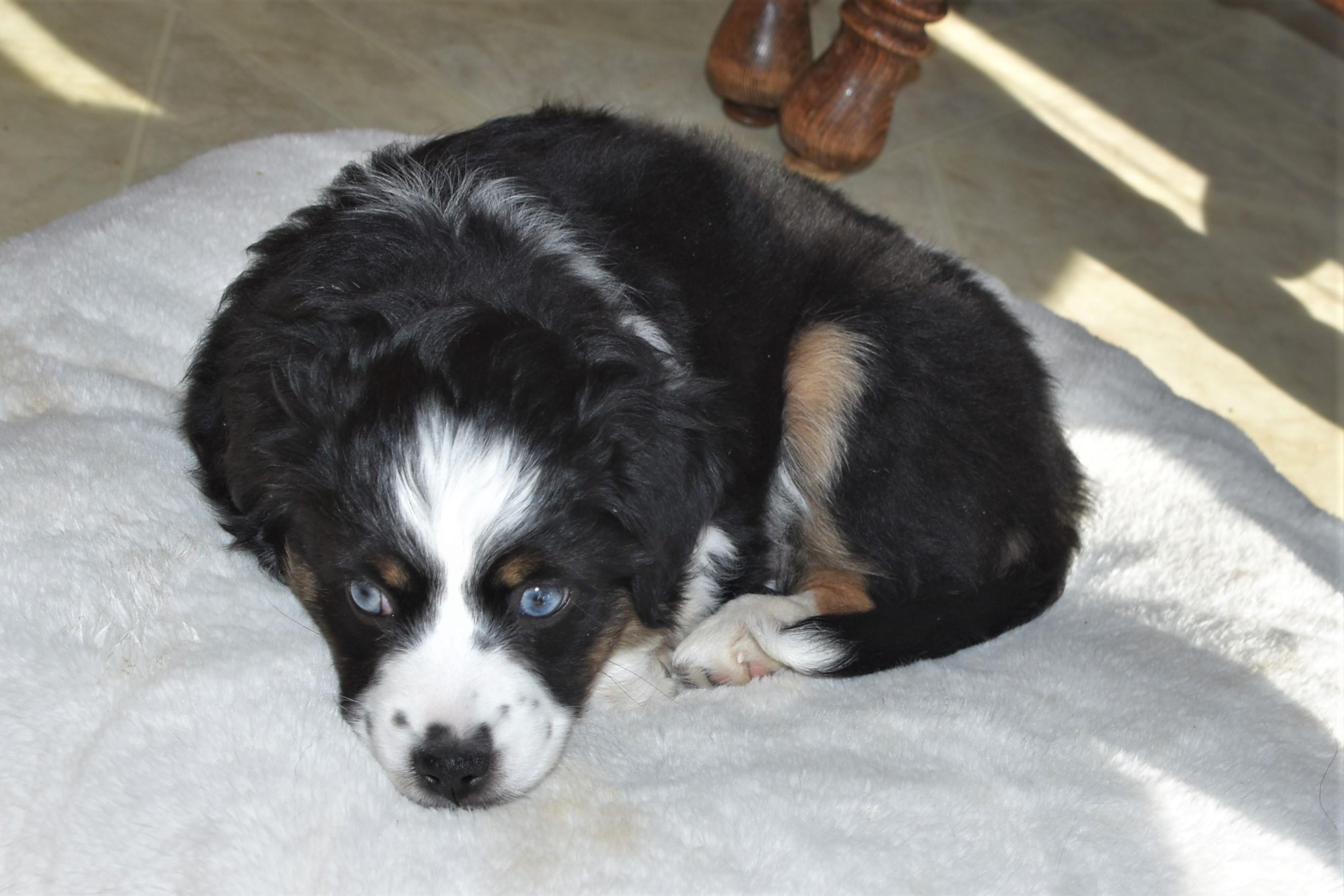 Our Miniature Australian Shepherd puppies include blue merle and black tri. Toy Australian Shepherd puppies are black tri. Colors will vary depending on the parent dogs.