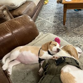 Kim was super friendly and easy to work with, whole process went extremely smooth. My Beagle, Duncan, is a healthy little boy and everyone that's seen him has fawned over how cute he is. He has a great personality and is really sweet. Most importantly though he and my 4 year old female AmStaff-Beagle mix get along really well and are either playing together, curled up with each other asleep, or he's in the floor barking at her to come down and play while she's up in the chair laying down because she needs a break. Little guy has nearly unlimited energy.