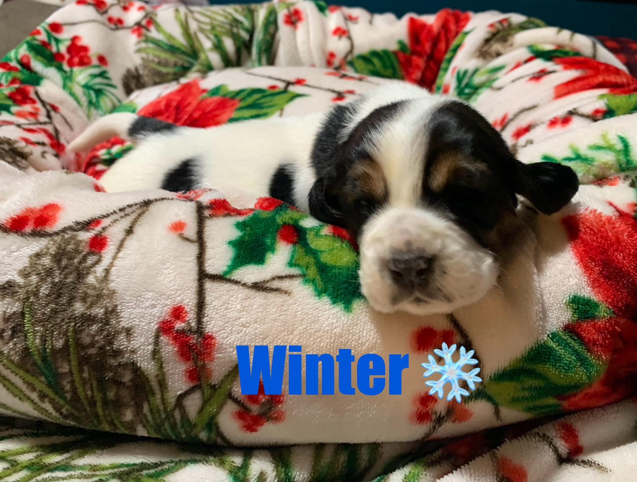 Our puppies include red and white, black and white, mahogany and white, and black brown and white. Colors will vary depending on the parent dogs.