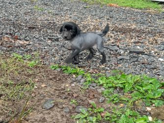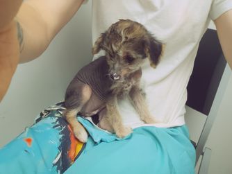 Grace is a hairy hairless Crested, mini Aussiedoodle.