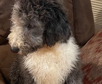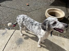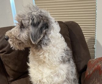 Zazu is a standard black/white parti poodle (AKC) with the phantom gene. As a puppy he was black and white now he is silver/white with black eyeliner. He is very sweet and gentle! Want to be loved and will try to be a lap dog. He has a tight curly coat, excellent disposition, and is on the smaller side of standard. He loves to play ball but his favorite toy is a stuffed ginger bread man we call gingie.