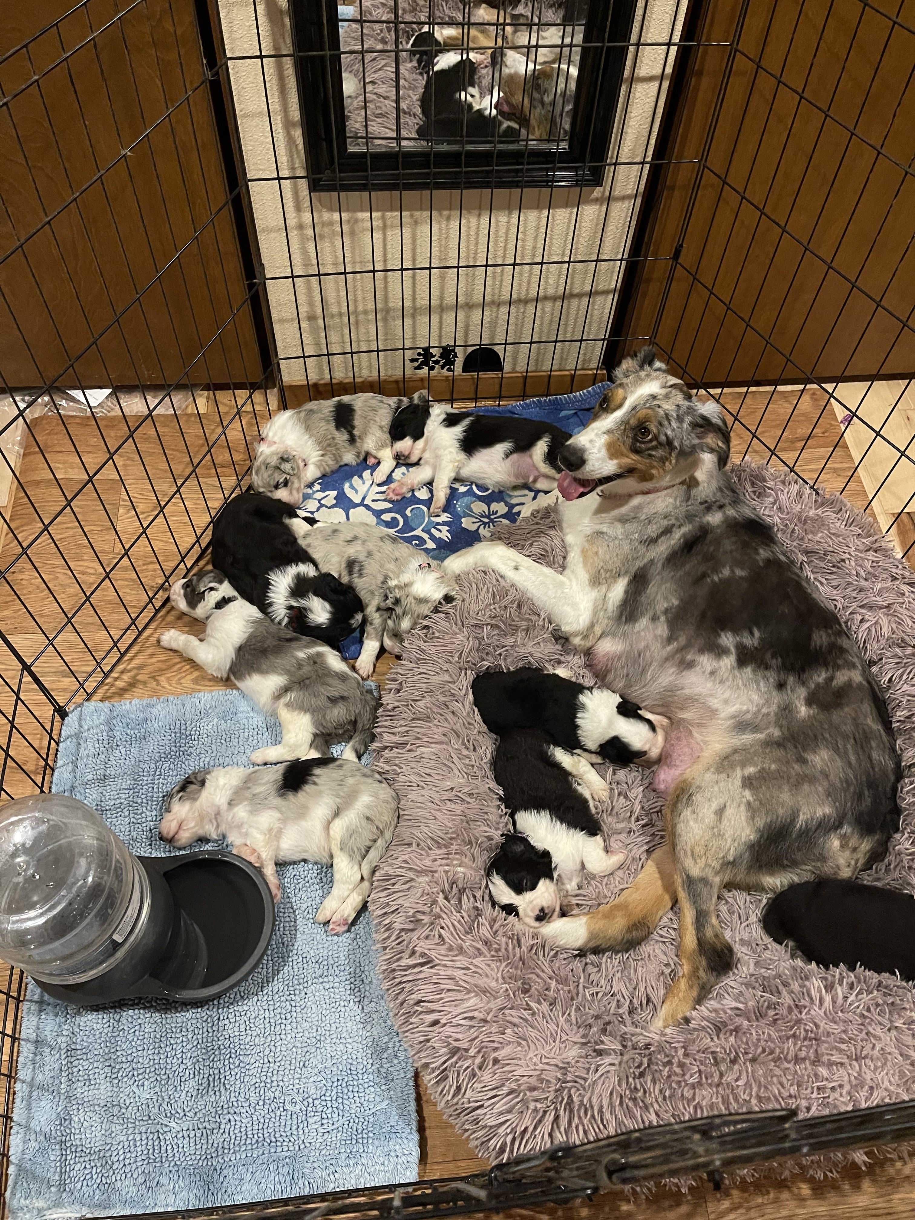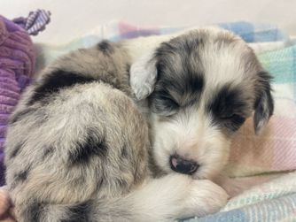 Our Aussiedoodle puppies include blue merle, red merle, black phantom, black and white, and black tri-color. Australian Shepherd puppies include red merle and blue merle. Poodle puppies include black, silver-beige, white, and parti. Colors will vary depending on the parent dogs.
