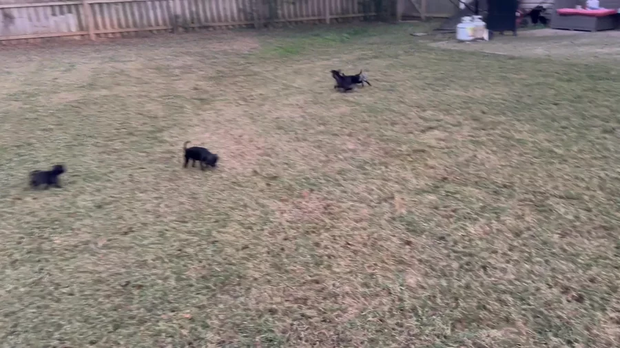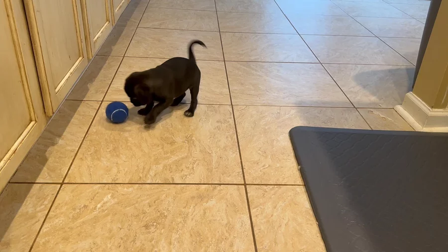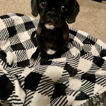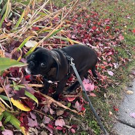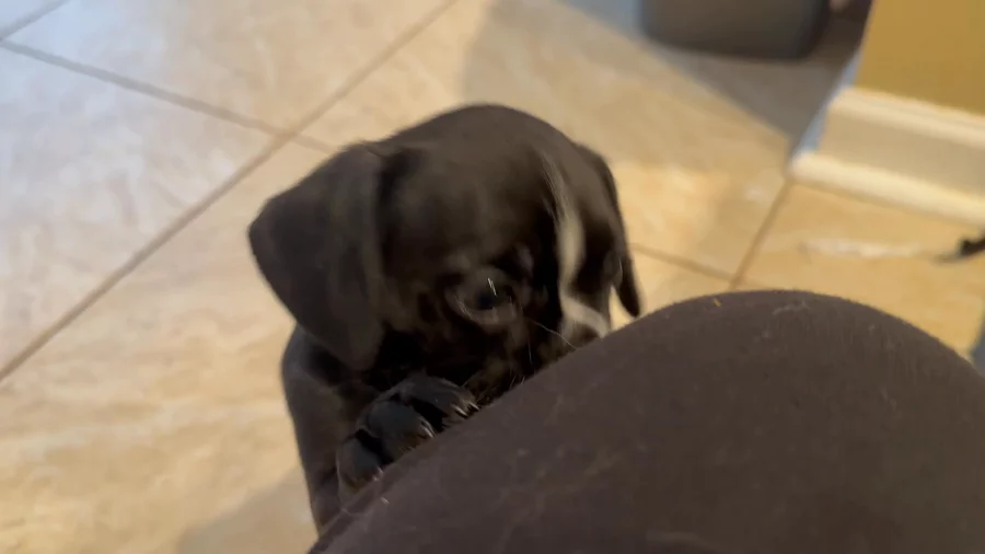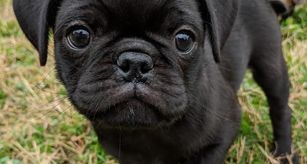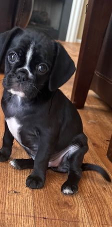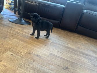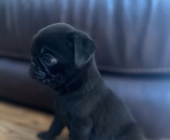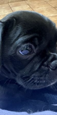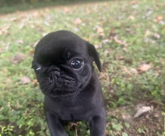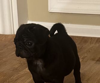 This black pug is just as cute as he could be, and is progressing nicely with house training. He is, however, very mischevious, energetic and fast and can traverse my extensive back yard in about 5 second. Like all pugs he's a people dog.