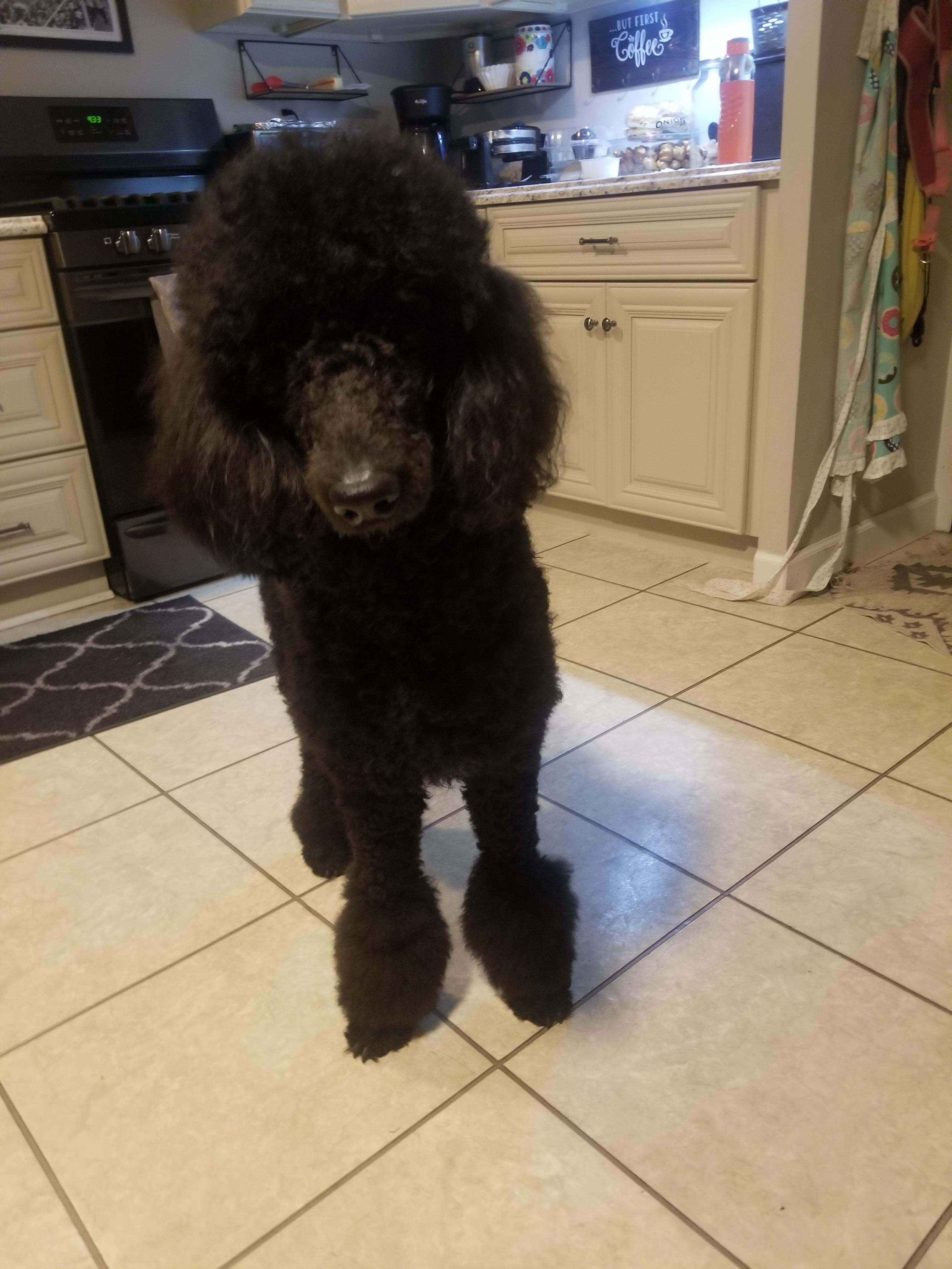 Black standard poodle 50 pounds. Sweet and very mild mannered