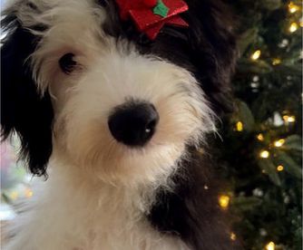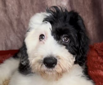 Our Goldendoodle puppies include cream, apricot, red, and parti. Sheepadoodle puppies are black and white. Colors will vary depending on the parent dogs.