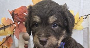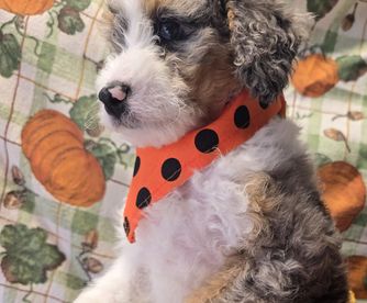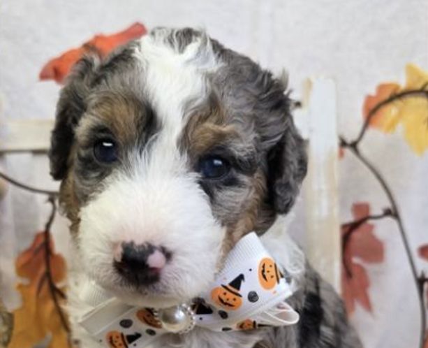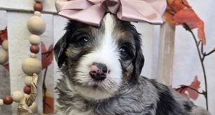 Our Bernedoodle puppies include chocolate merle, brown, and blue merle. Goldendoodle puppies are chocolate. Colors will vary depending on the parent dogs.
