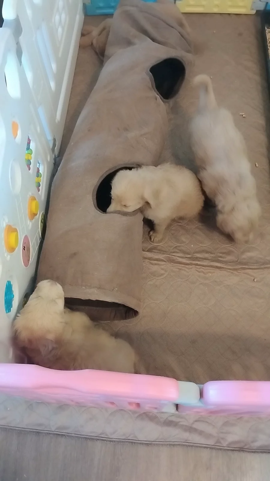 Kennel acclimation begins with a new set-up inside. Toyless for the moment because they were loving the open space.
