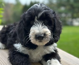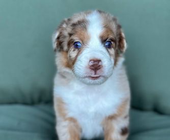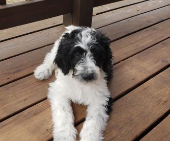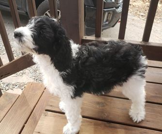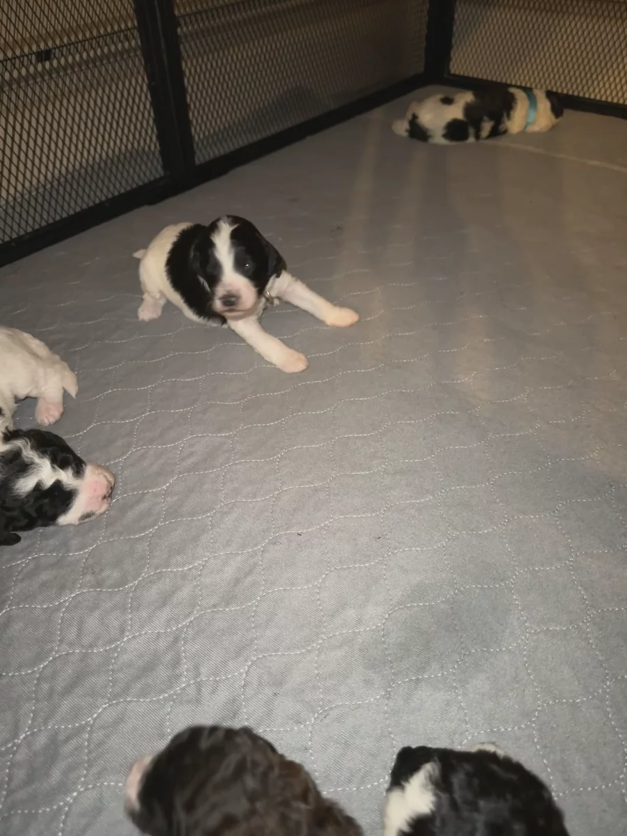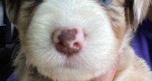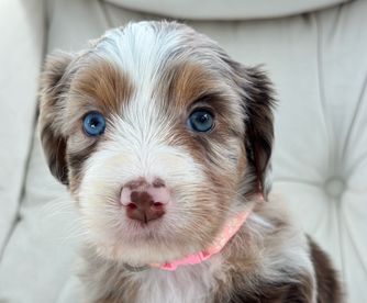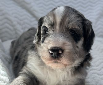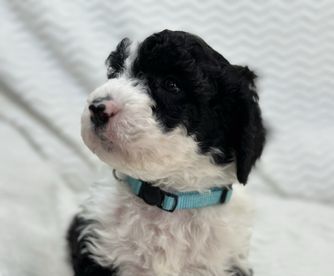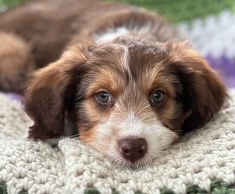 Aussiedoodle puppies include brown and white, blue merle, and black and white. Colors will vary depending on the parent dogs.
