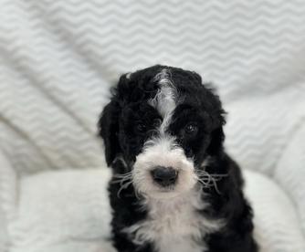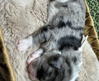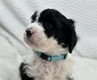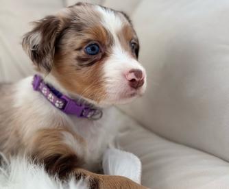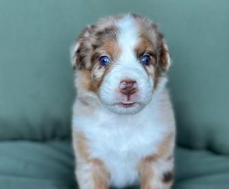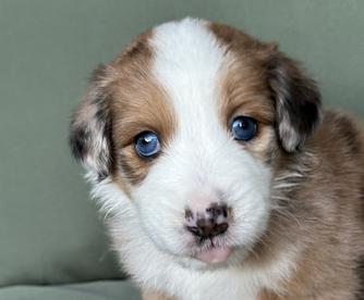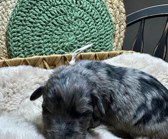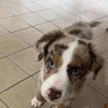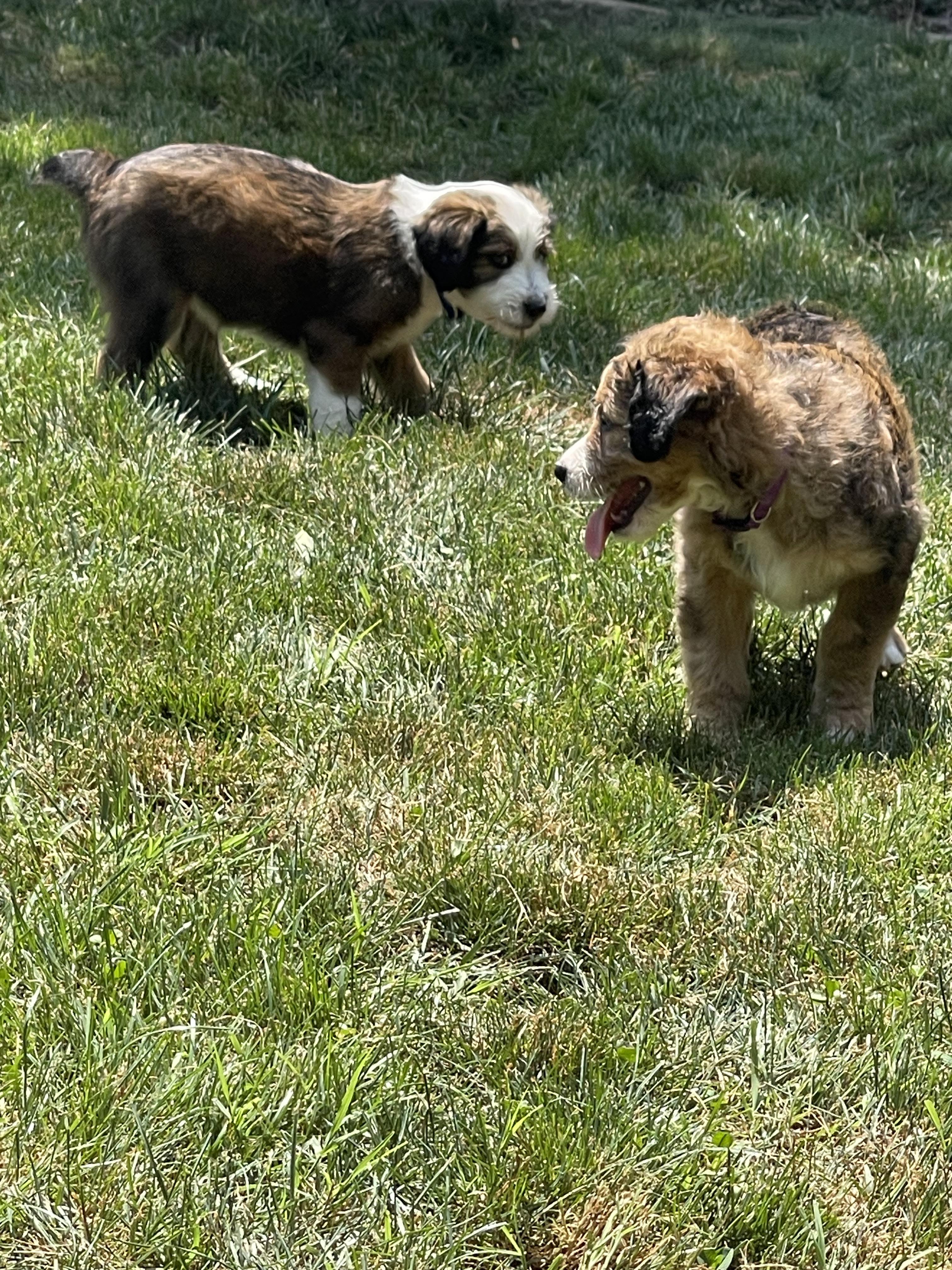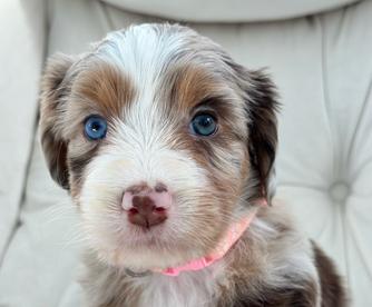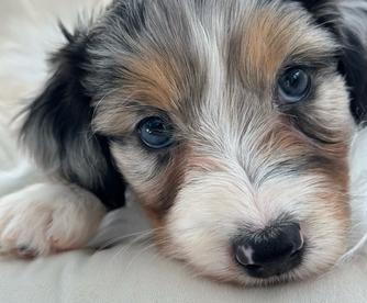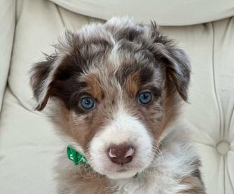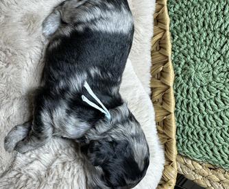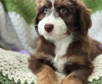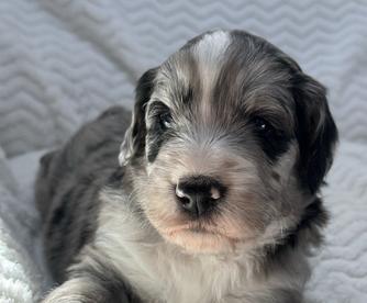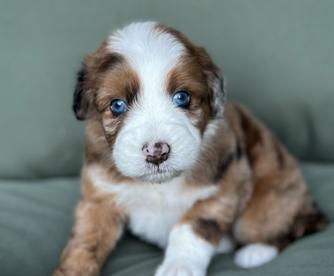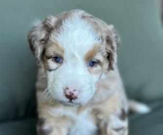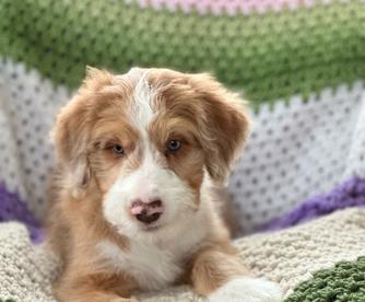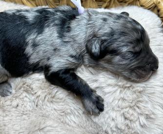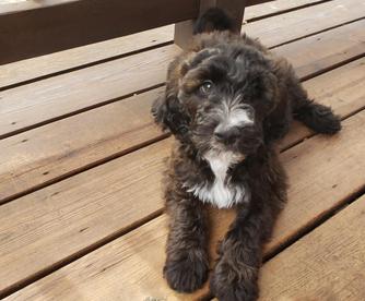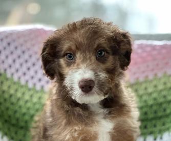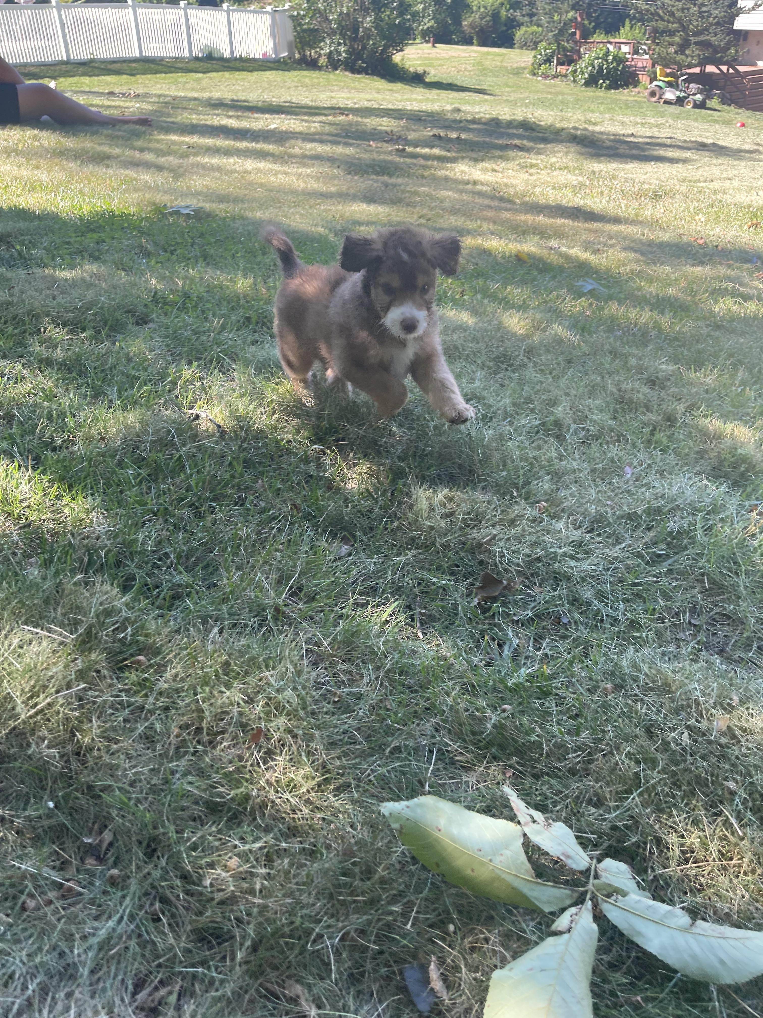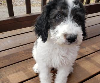 Our Aussiedoodle puppies include brown and white, blue merle, and black and white. Colors will vary depending on the parent dogs.