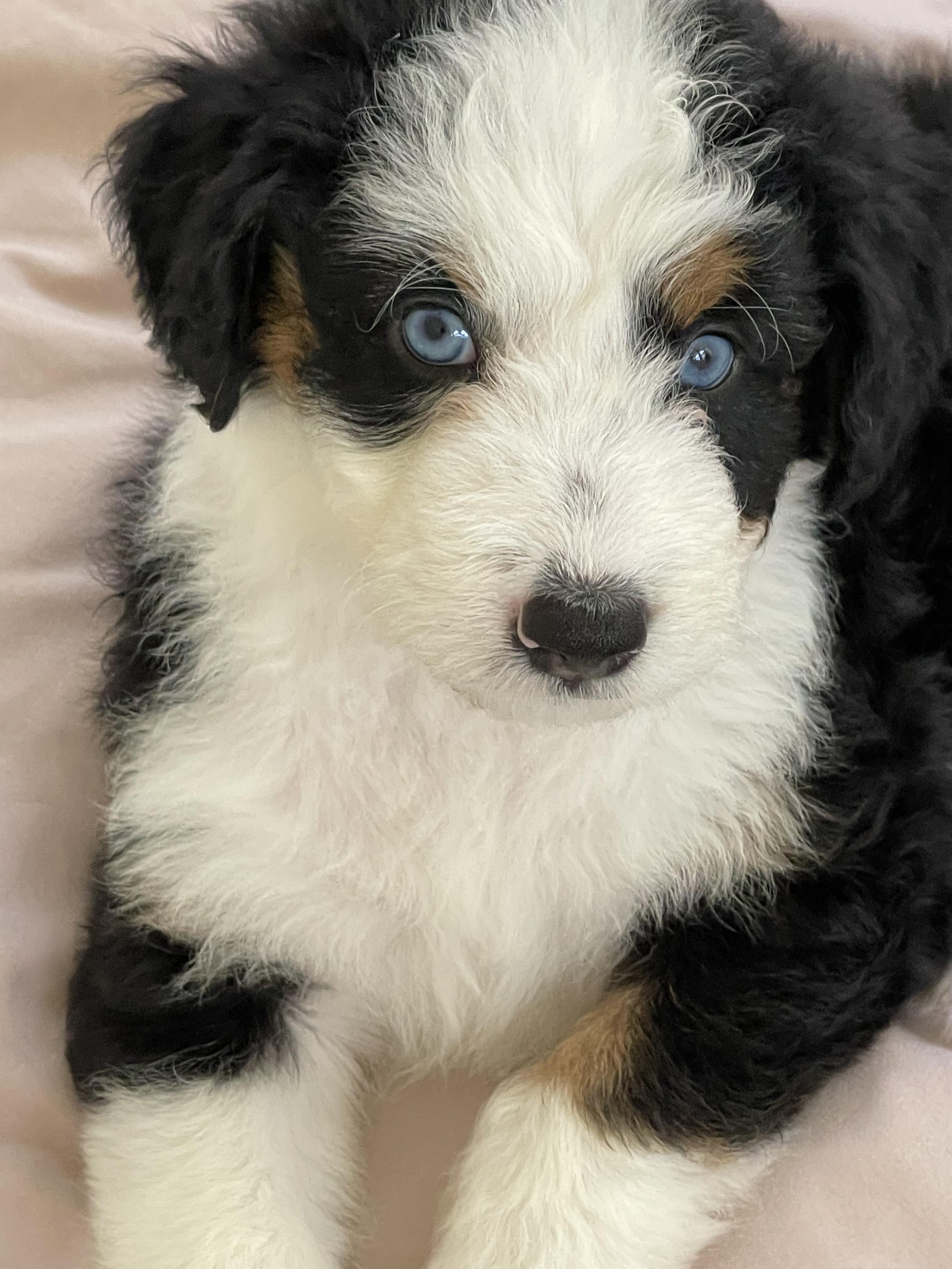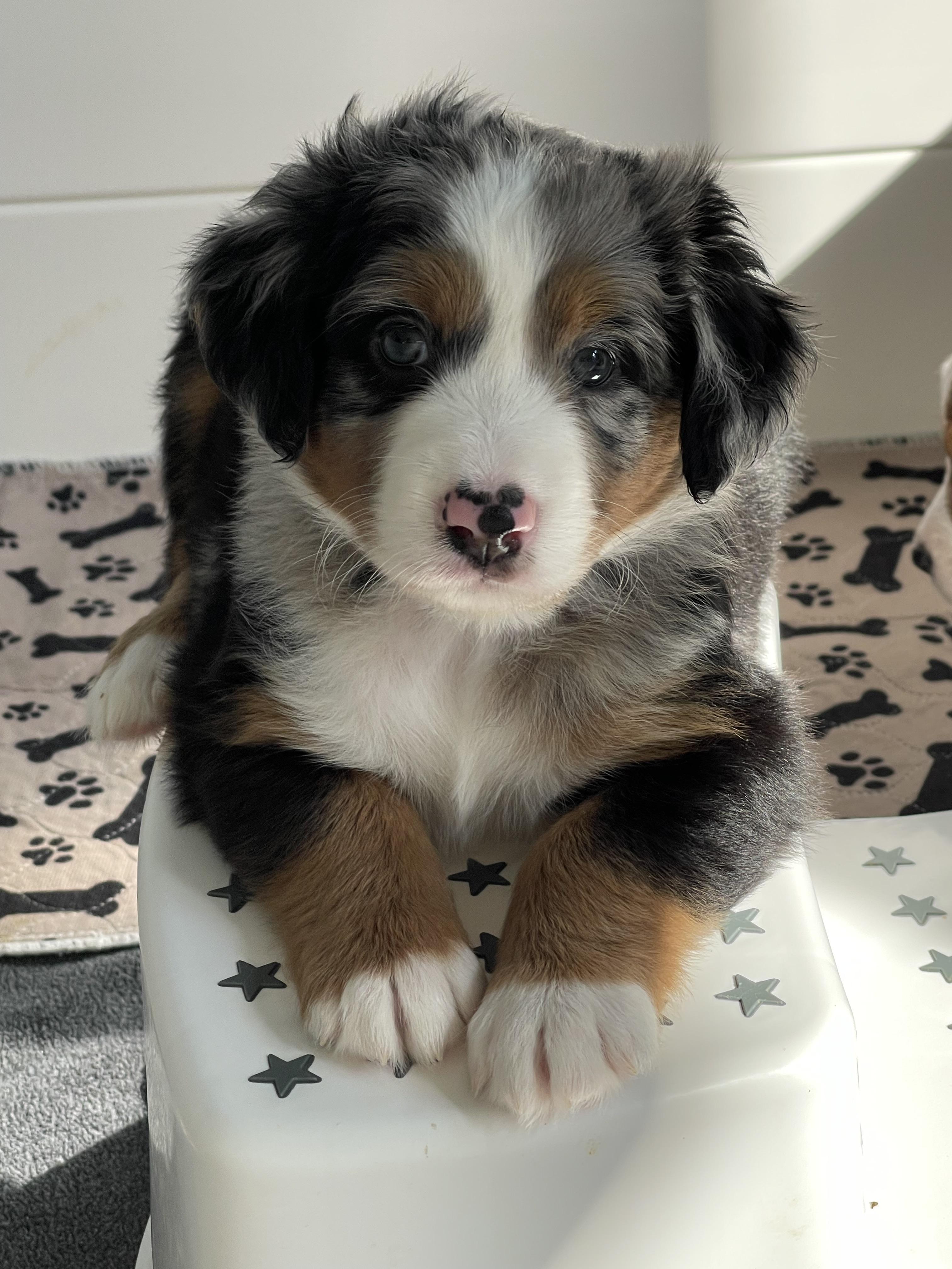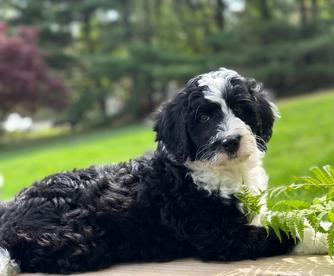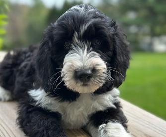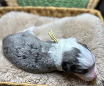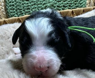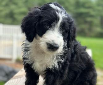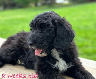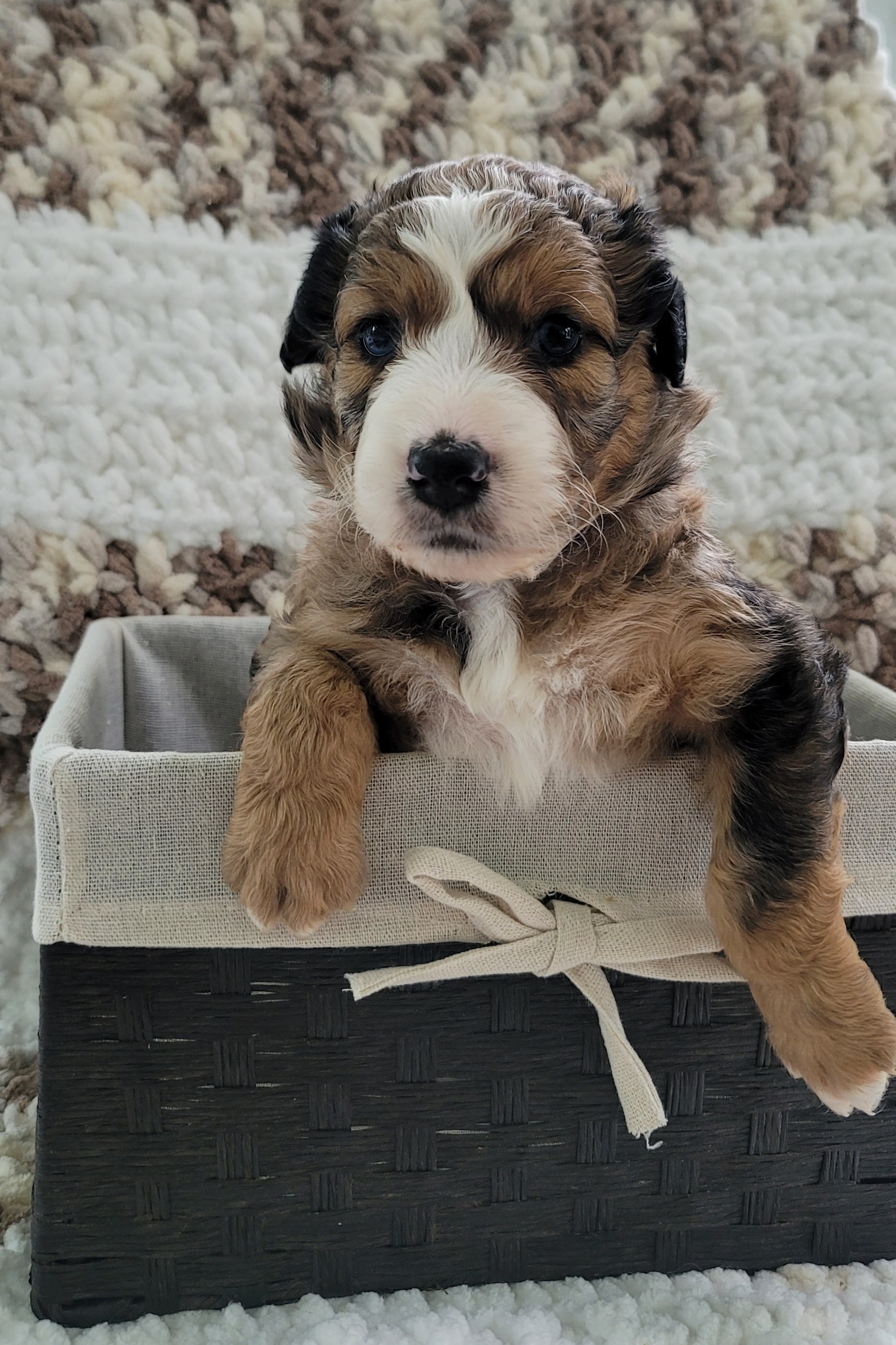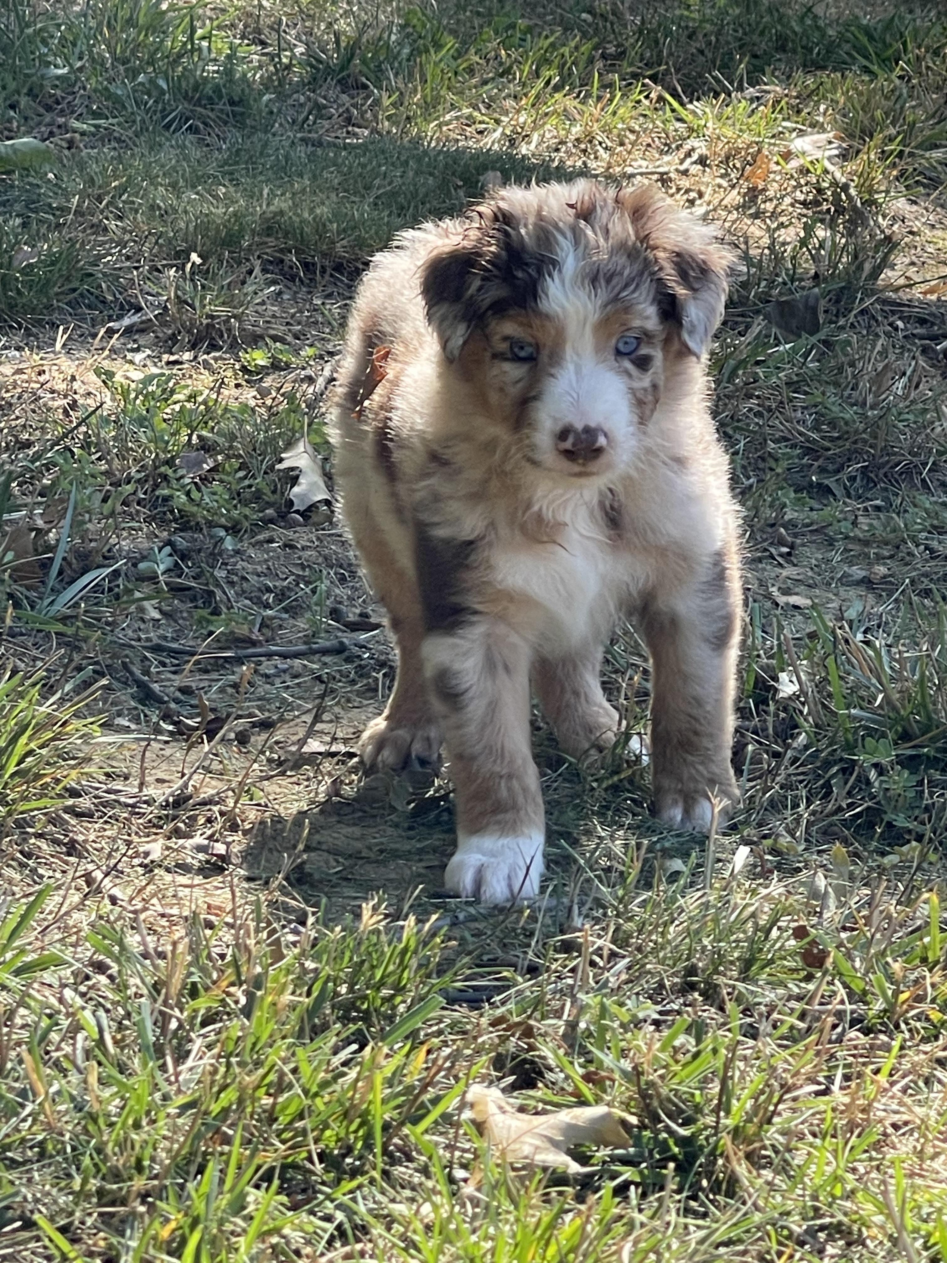 Our Aussiedoodle puppies include brown and white, blue merle, and black and white. Colors will vary depending on the parent dogs.