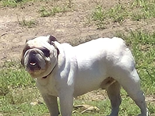 Ezzy is a sweet girl. She weighs about 35 lbs and is solid white with brindle patches on her eyes. She is a fourth generation Lowery bulldog born and bred here. She has a wonderful temperament and confirmation to pass on to her babies. Ezzy is smart and goofy and the ultimate cuddle bug.