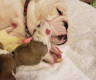Sullivan is a male Bulldog. Carefully selected as a great representative of his breed, Emily decided to make him part of their program. Emily has passed Good Dog’s screening process, which involved a review of their breeding practices, environment, and the mental and physical health of their dogs.