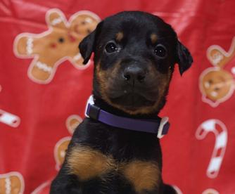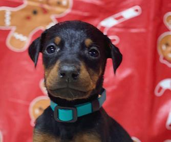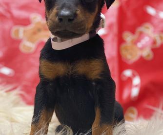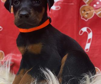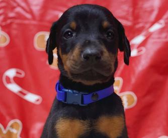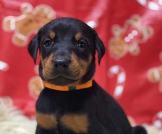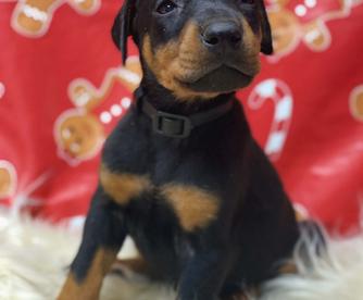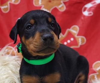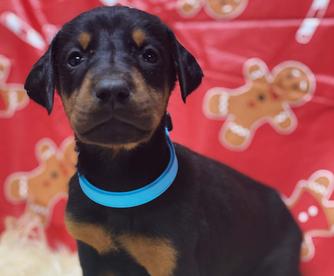 Our Doberman Pinscher puppies include black and rust and red and rust. Giant Schnauzer puppies are black. Colors will vary depending on the parent dogs.