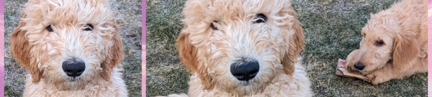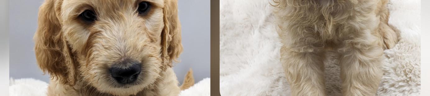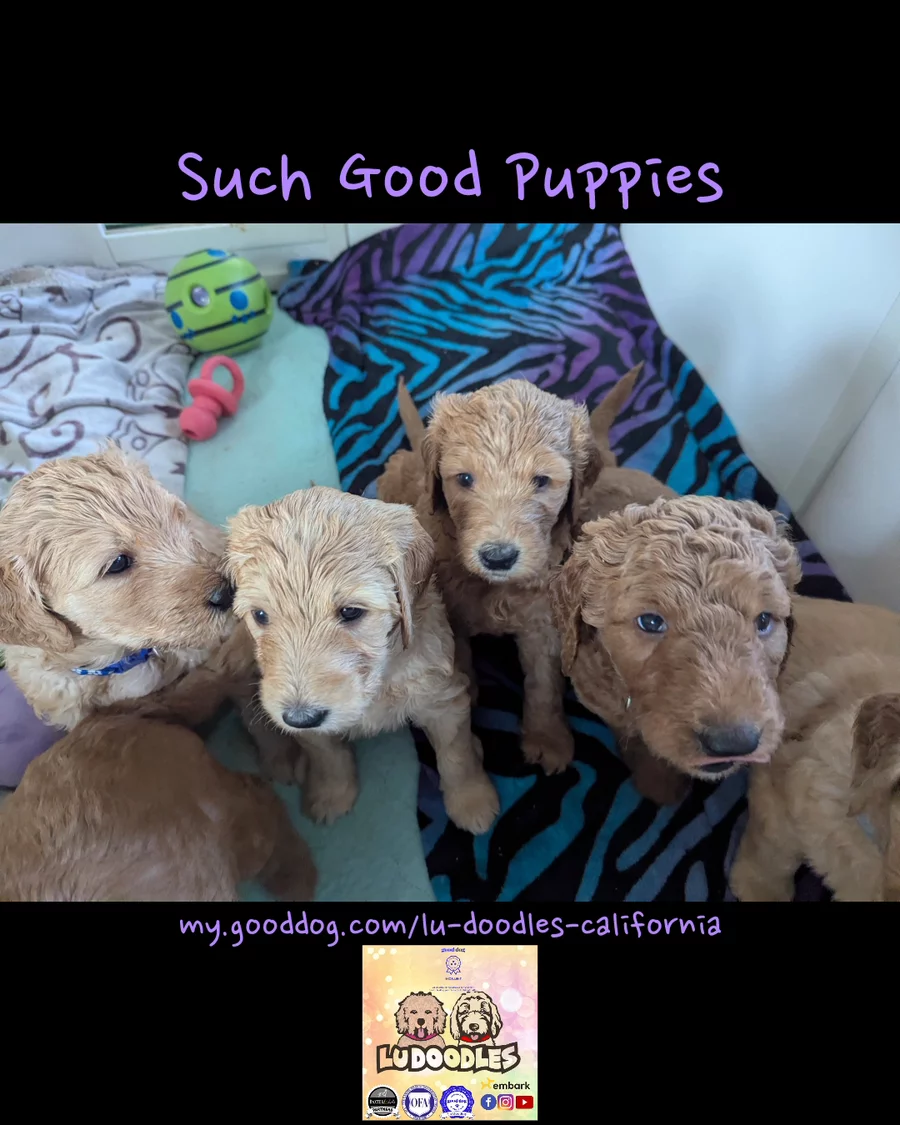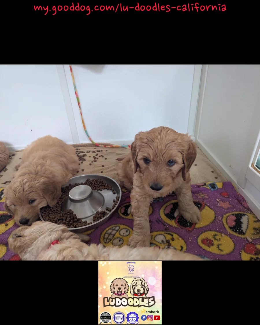 Photo dump of our Sweet Little Lu Doodles in their everyday lives. They are robust puppies - all ranging 8.75lbs to 10.25lbs. Their growth rate is incredible. They're eating kibble and love chewing on the healthy ingredient chew treats. They have tried fish skins, beef trachea and beef bone marrow, in addition to their normal diet of boiled shredded chicken and puppy kibble. They have also tried and enjoyed boiled eggs, banana and cheese. They all know when I'm coming to feed them and sit nicely making eye contact with me. I have also spent a significant time hand feeding each of them, so they are very gentle.