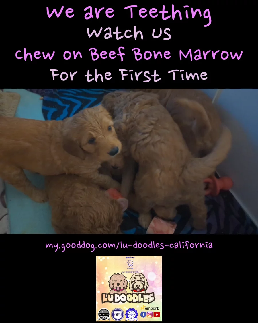 Our Sweet Little Lu Doodles are actively teething. One of the best things you can do as an owner is find your puppy these beef marrow bones at a local pet store in the freezer section (they usually come in a bag of 8) or with your local butcher - ask them, they make those cuts for you.