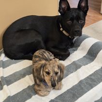 Lotti is thriving! Her transition was seamless, taking just days. She is now the undisputed leader of the pack, ruling over our 20-pound Jack Russell Lucy and 50-pound rescue Khoda. Watching her in action—hanging off the Khoda' jowl or executing quick tactical strikes from under the bed—is truly a sight to behold!