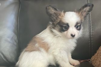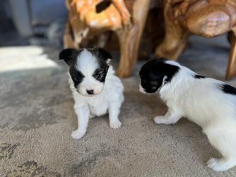 Our Papillon puppies include red white and sable and black brown and white. Shetland Sheepdog puppies include black white and tan, sable merle and white, sable and white, and blue merle and white. Colors will vary depending on the parent dogs.