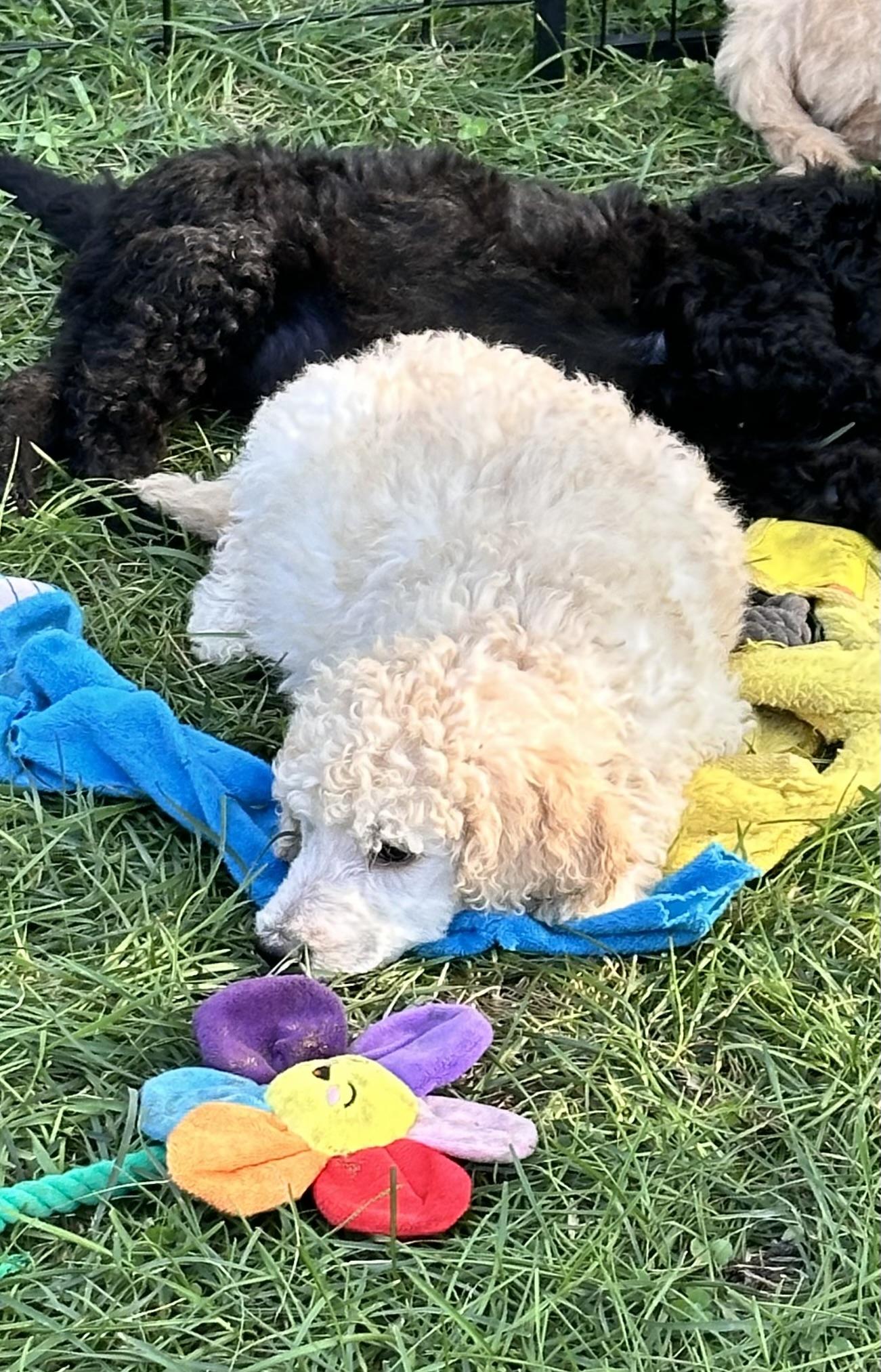 Our puppies include apricot, black, cream, and red. Colors will vary depending on the parent dogs.