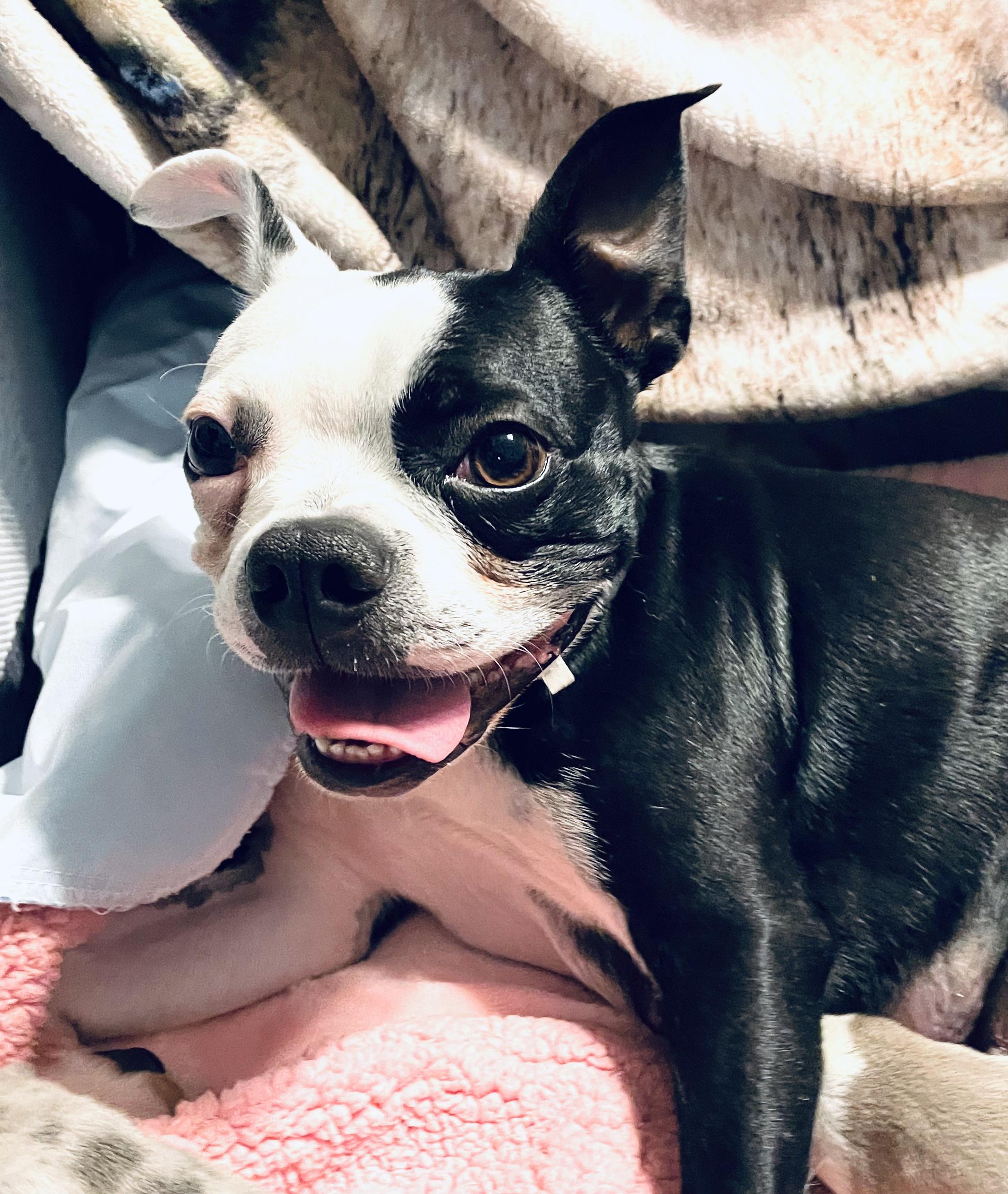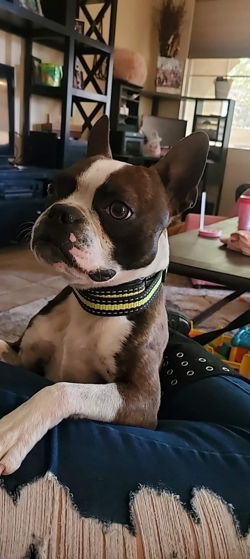 Quinn is one of the sweetest Boston’s we’ve owned. She loves to cuddle under the blankies and is very gentle. She listens well and is very emotionally in tune with her people.