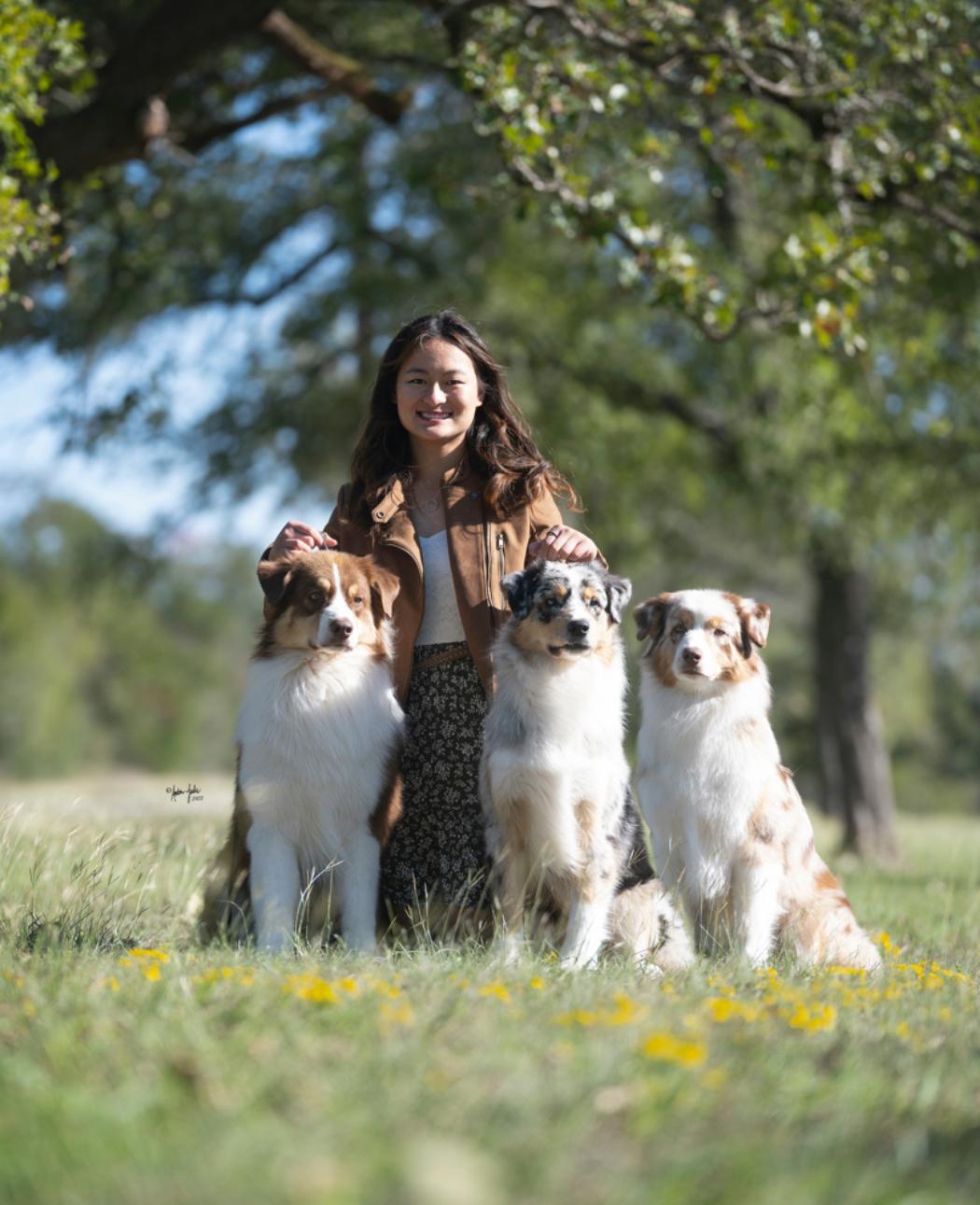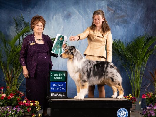 I have always loved dogs and enjoyed training my family's dogs growing up, in 2017 I was introduced to the world of dog shows when a breeder offered me the chance to co-own, raise, and show a gorgeous Blue Merle Aussie. Since then, I have titled multiple dogs in different venues as well as becoming a certified Canine Good Citizen evaluator.