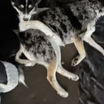 Beautiful merle with a very sweet temperament, very outgoing, loves the outdoors, camping with our family, enjoying the snow, enjoys cuddles, and loves kids, dogs and cats!