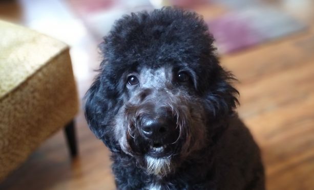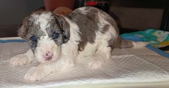 ACA miniature poodle. Full of life and love. He's a hidden merle, with one blue eye, so he produces beautifully colored and patterned litters. He is our in-home pet and provides us a lifetime of affection and joy.