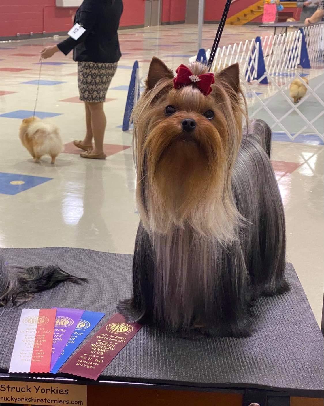 I got my first Yorkies over 18 years ago and were LuvStruck. I started going to local dog shows and watching the breed at AKC shows. I reached out to and developed relationships with now lifelong friends that share my love and due diligence for the breed. I started showing Yorkies about 13 years ago and have enjoyed it ever since.