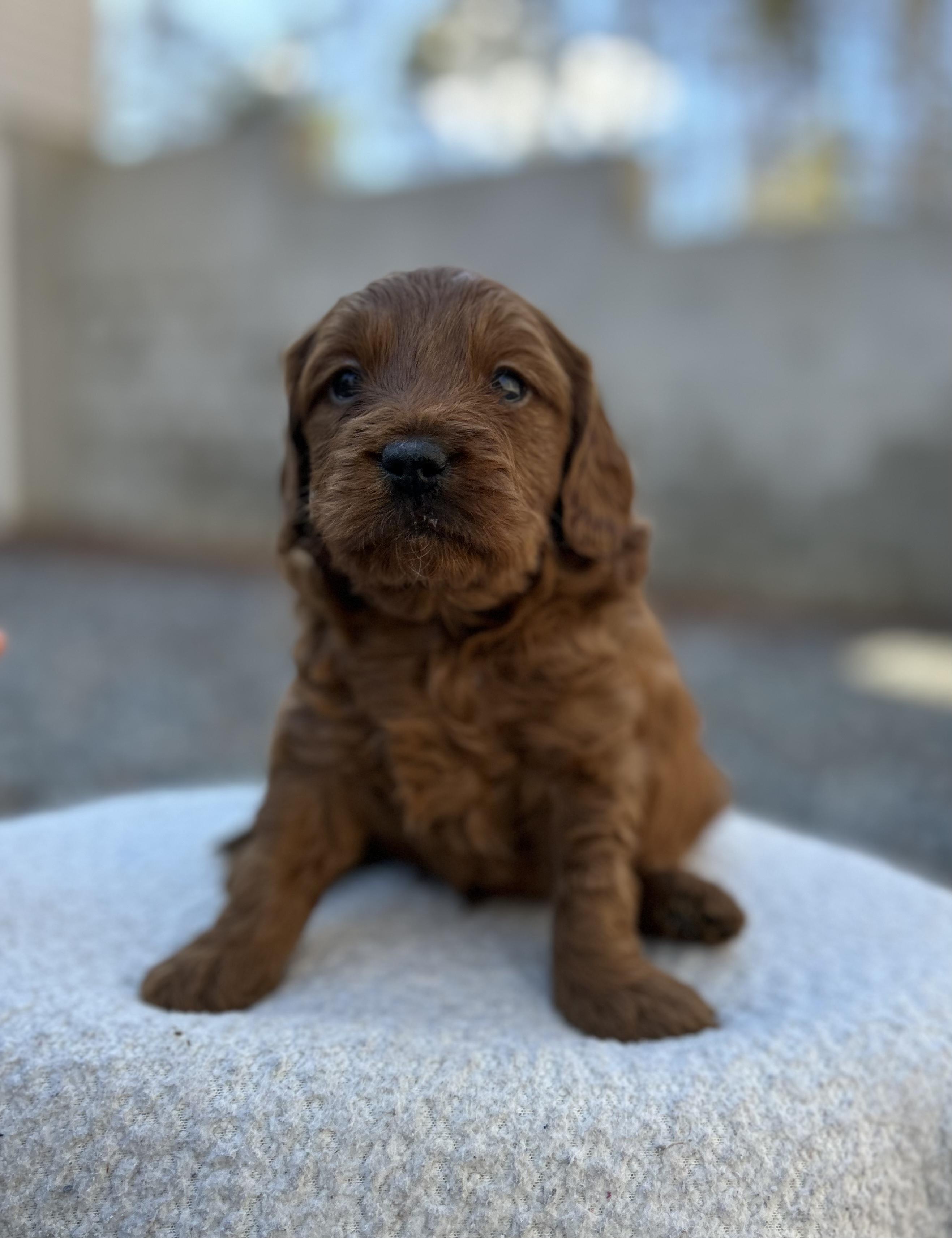 Our Golden Retriever puppies are dark golden. Bernedoodle puppies are tri-color. Goldendoodle puppies include apricot and red. Colors will vary depending on the parent dogs.