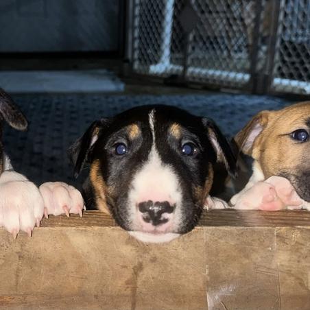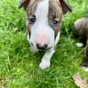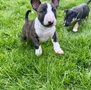 Our experience with Kelly from our first communications, through choosing our pup, staying informed while waiting for "gotcha day", and the follow up afterwards, proved to be a professional and joyful experience for us! Kelly was an exceptional communicator who sent frequent photos, helping us to choose our girl from long distance, and then helping us feel connected to her as she grew and went through some of her firsts (opening eyes, outside play, eating solids, etc.). Her thoughtful efforts gave us a peek into watching all of the puppies in her litter as all of their personalities started to emerge. She was very accommodating with the pick up logistics, making meeting our little Rikka (Ricochet) even more memorable. We were thrilled that crate training and potty routines were introduced early in Kelly's home. Our pup adapted into good, happy habits early on as she settled into her new home environment, and has been transitioning into obedience training really well. It is easy to see that Kelly's parent dogs and new litters are reared in a loving, experienced home environment. We are thankful we were able to find a breeder who cares about keeping the breed true and prioritizes retaining excellent companion dogs in her lines. We are so excited about having this healthy, happy funny bull terrier as part of our family!