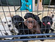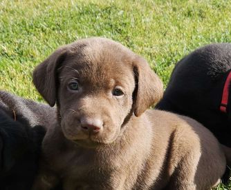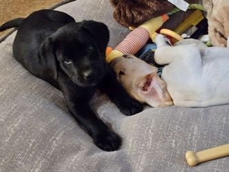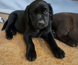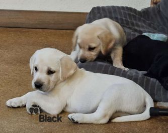 Our Labrador Retriever puppies include black, chocolate, and yellow. Cardigan Welsh Corgi puppies are black and white. Colors will vary depending on the parent dogs.