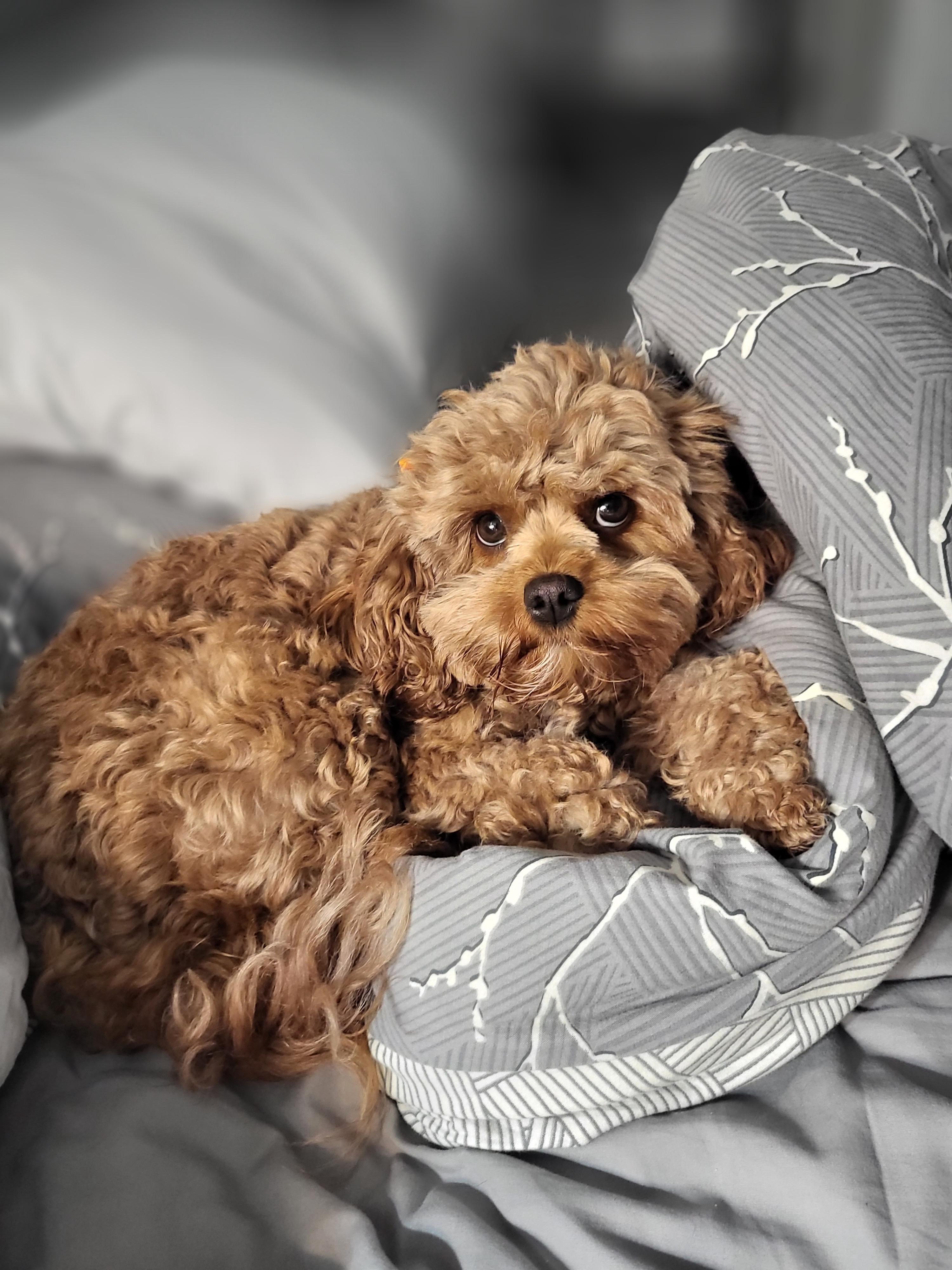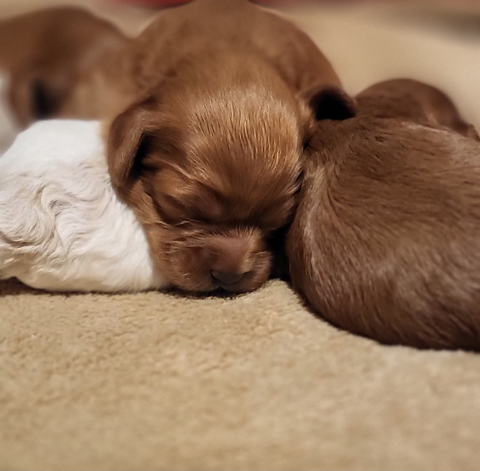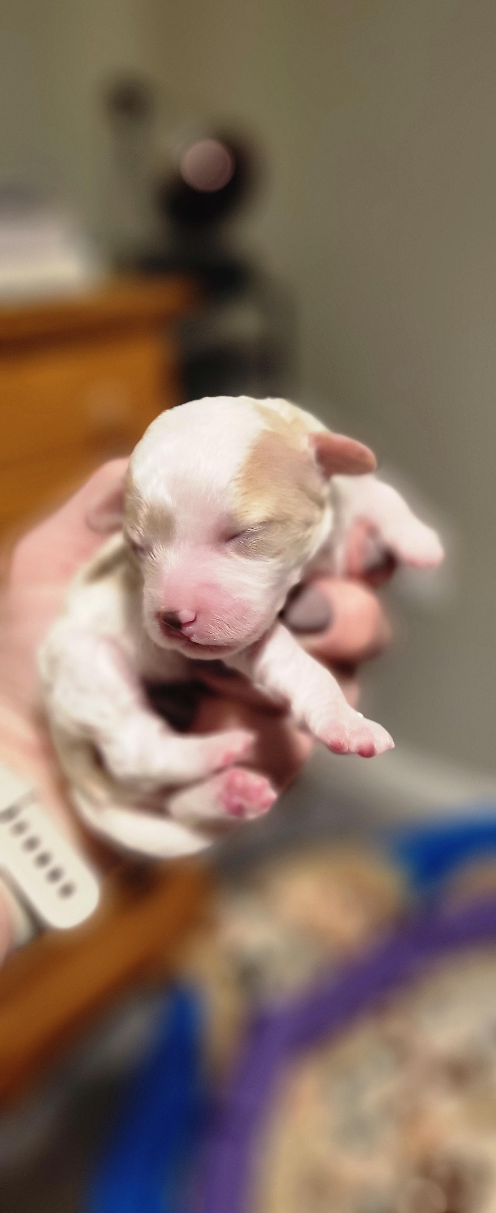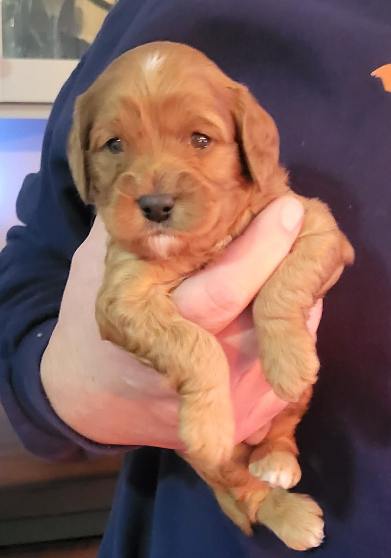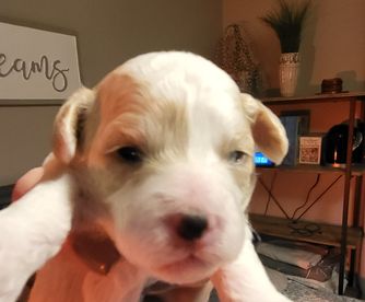 Pups are F1B Cavapoos (25% Cavalier King Charles, 75% Miniature Poodle). Low to no shedding and hypoallergenic. Both mom and dad are DNA tested through Embark to ensure no genetic health conditions would be passed on. Both carry Intense Red Pigmentation, meaning the puppy's coats will only become a deeper apricot color as they age.