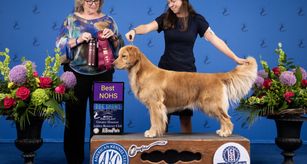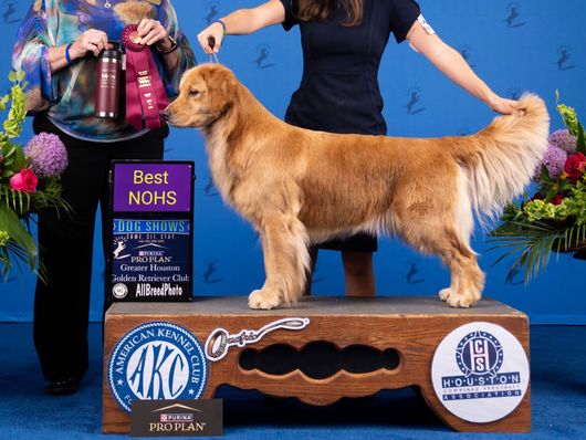 My first Golden and first show dog, Kiwi impresses me every day! Not only is she physically what a golden retriever should be with consistently healthy and ideal goldens behind her pedigree, but she by far has the most solid, reliable, and in general chill temperament. We have brought her all over the country to countless dog shows with hundreds of other dogs and people around, and she has yet to meet someone (dog or person) she doesn’t absolutely love. She is the exact same dog hanging out at home, watching fireworks, in a busy convention center, or at a horse show (my personal hobby lol). While she may be relaxed in any situation/environment you throw at her, she is ALWAYS down for a game of fetch, or going for a swim or run! She is ready to go at the drop of a hat!