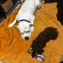 My Barney has been a big emotional support for me. He goes with me most days to my work location, an airport flight school. He is the center of attention and enjoys playing with a big American Bulldog named Ghost. Ghost tolerates Barney who climbs on him.