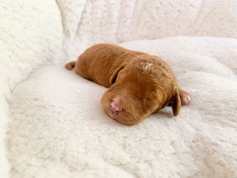 Our Goldendoodle puppies include cream, apricot, and red. Aussiedoodle puppies include blue merle, red merle, and black tri-color. Colors will vary depending on the parent dogs.