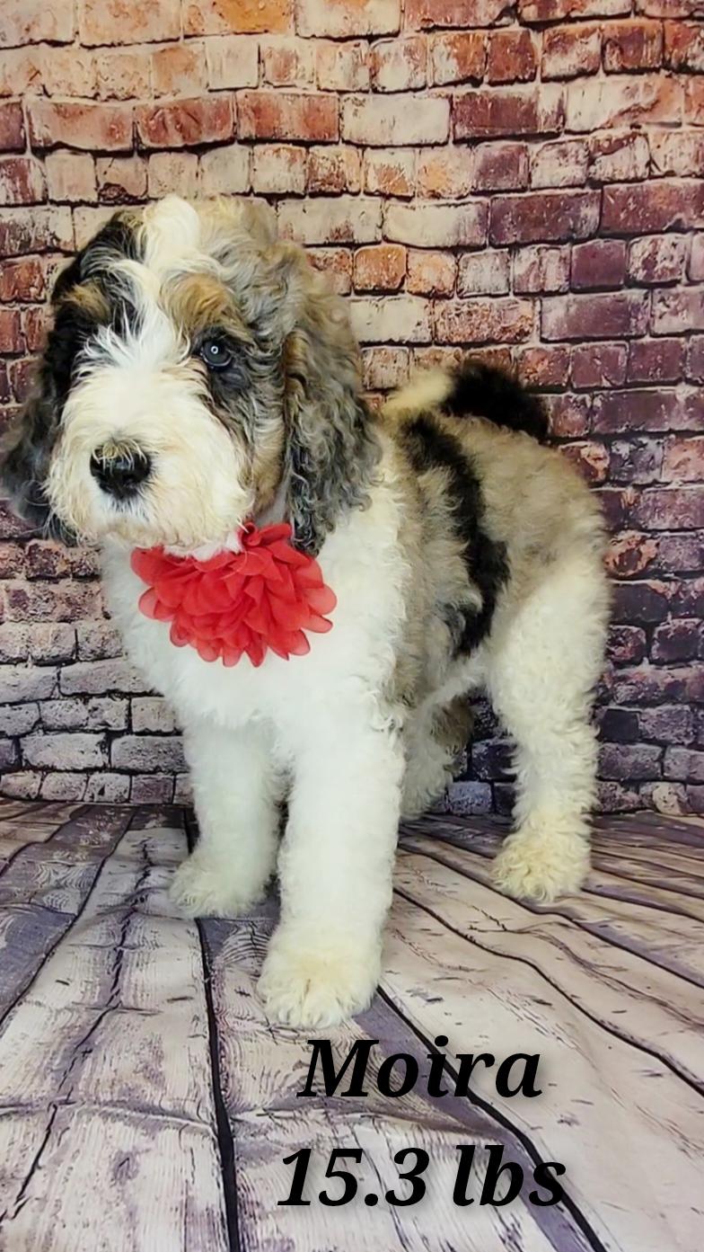 Poppy is the sweetest cuddle bug—soft, curly, and endlessly affectionate. She has a beautiful merle coat and calm, gentle temperament. She loves everyone she meets and is just as happy curled up on the couch as she is joining in on an adventure.