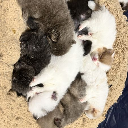 6 of the 9 puppies from Jessie and Jasmine’s first litter in July 2025 along with LeiLei 4 months old (black Pom) who thinks she’s one of the pack.