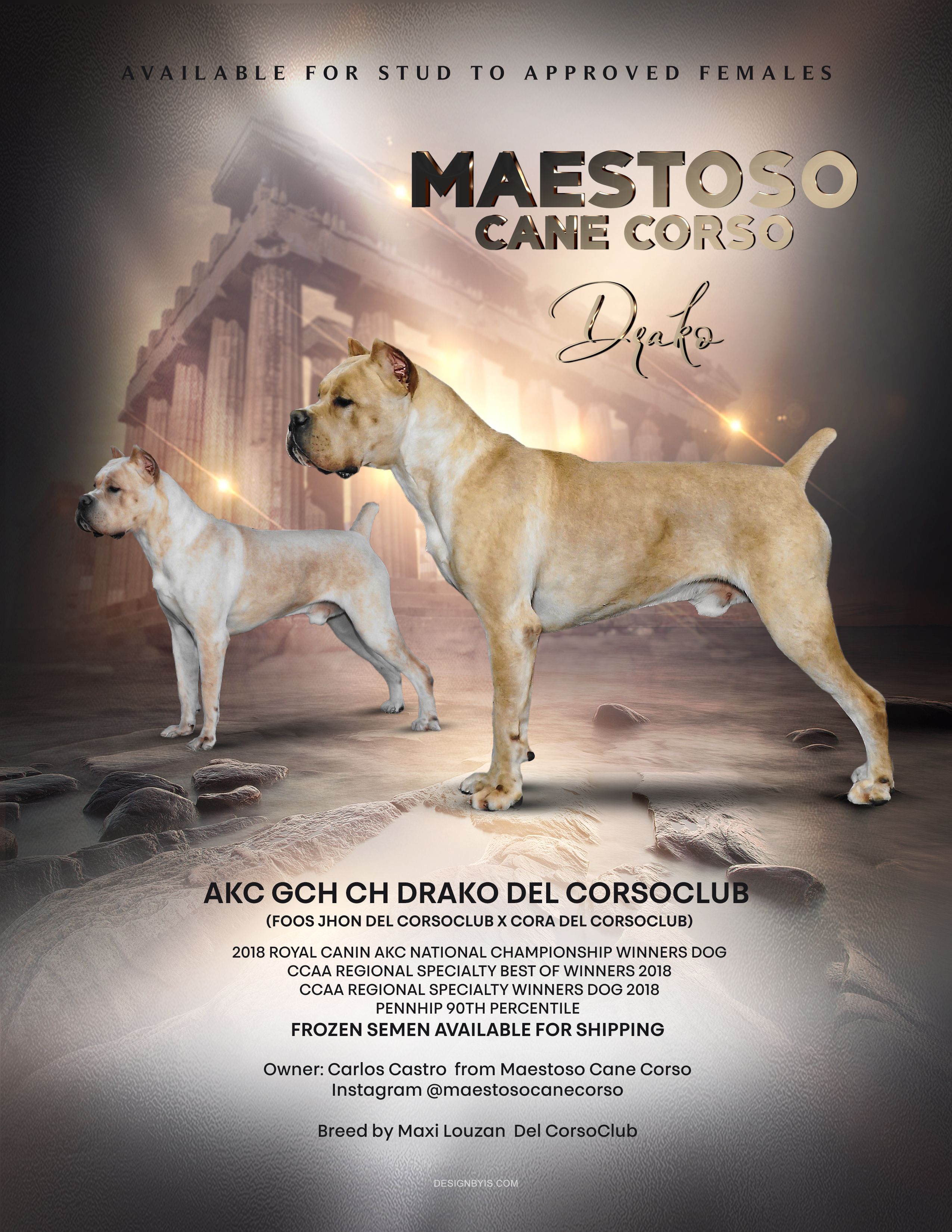 Drako is a male Cane Corso about 7 years old. Carefully selected as a great representative of his breed, Carlos decided to make him part of their program. Carlos has passed Good Dog’s screening process, which involved a review of their breeding practices, environment, and the mental and physical health of their dogs.