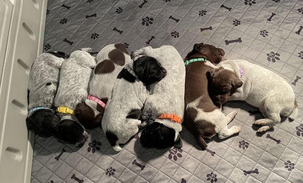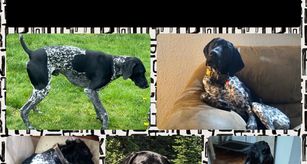 Sage was born in Missouri, and came to us in August of 2022. She is the second GSP we have ever owned. We knew right away that she would be a good mother, since she is always mothering our Vizsla, Ginger. Sage is an avid hunter, and will hunt anything from birds to bugs! She has brought us various "gifts" from the backyard, including birds and rabbits. Like most GSPs, she is very active during the day, preferring to scour our large yard for prey, chase her sister, or follow us as we do outdoor chores. In the evening, she is content to snuggle with her sister on the couch with Dad. Sage loves heat, and will sit in front of the wall heater in our bathroom or in the den. She also has a quirky side, especially when she lies on her back and shows her teeth, looking like a crocodile. Sage is very social and friendly, and is really drawn to kids, since the first 10 weeks of her life were spent with small children.
