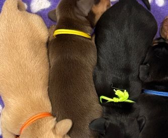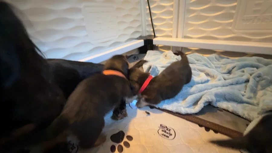 The puppies are three weeks old now and growing fast! Their eyes are fully open, and they’re becoming more aware of their surroundings. They’re starting to wobble around on their little legs, exploring their whelping area and interacting with each other. Personalities are beginning to emerge, and it’s so fun to watch them become more curious and playful. Stay tuned for more adorable updates!