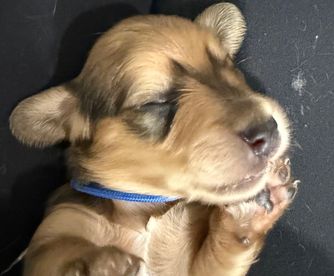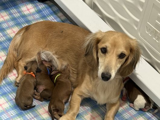 cream miniature dachshund sire with a gentle, regal presence. He combines elegance and charm with a sweet, affectionate temperament, making him a wonderful companion and a valuable addition to our breeding program.