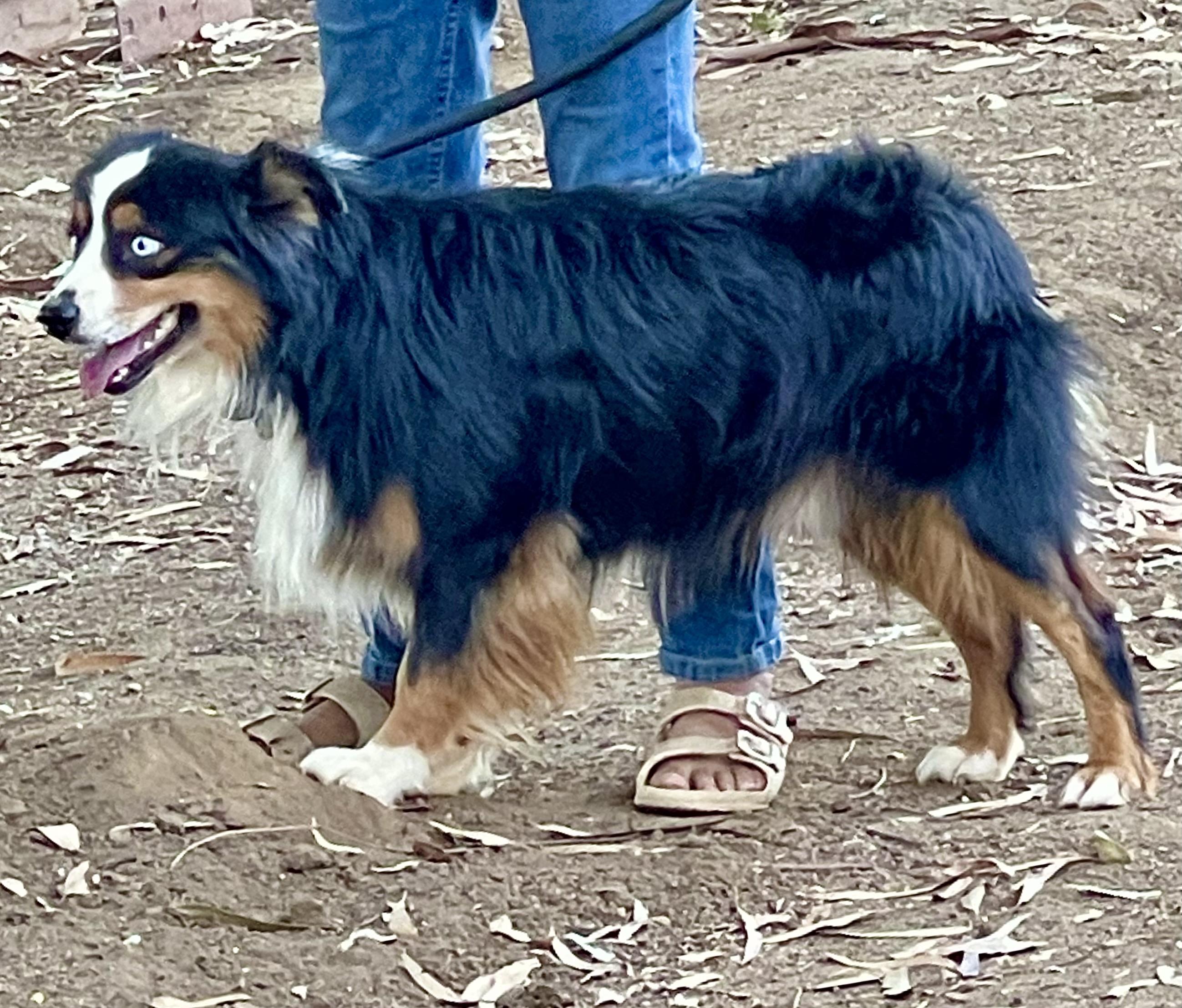 Ranger is a black tri with blue eyes and is definitely passing that on to his babies! His first two litters have had all blue eyes! He is midsize mini at 16” and 27 pounds.
