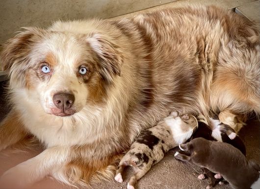 Dixie is a female Miniature Australian Shepherd. Carefully selected as a great representative of her breed, Dena decided to make her part of their program. Dena has passed Good Dog’s screening process, which involved a review of their breeding practices, environment, and the mental and physical health of their dogs.